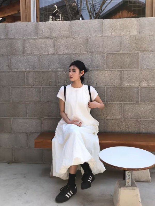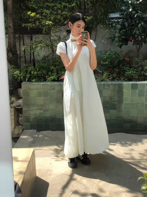 シーズンのエッセンスを感じさせる裾バルーンノースリーブロングワンピース。