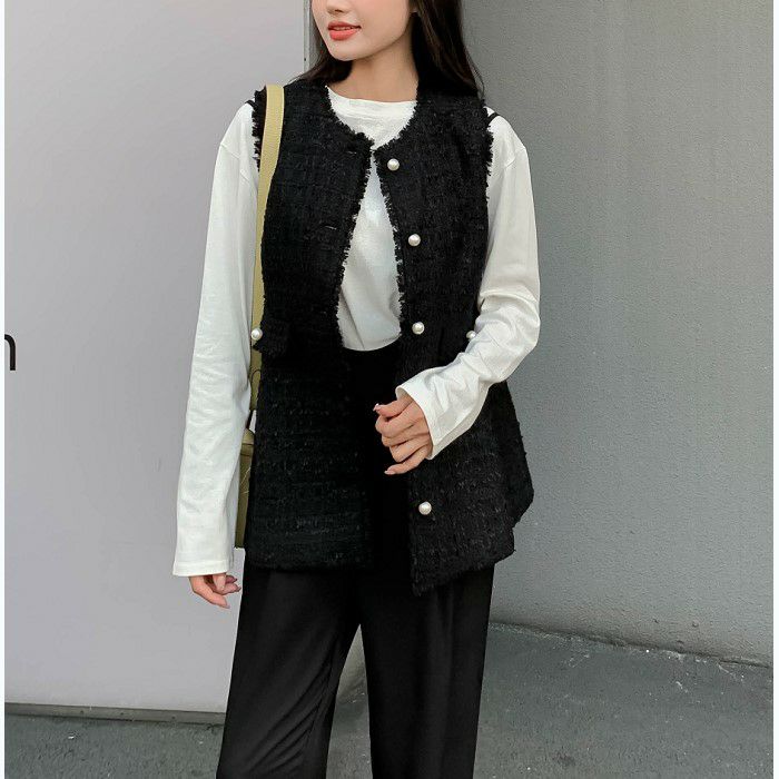 一部即納 2color ペプラム パール ボタン ツイード ジレ