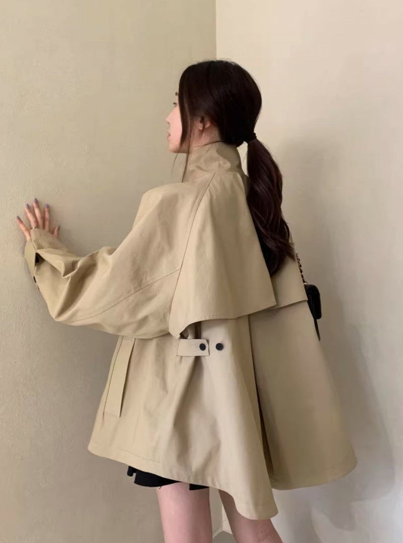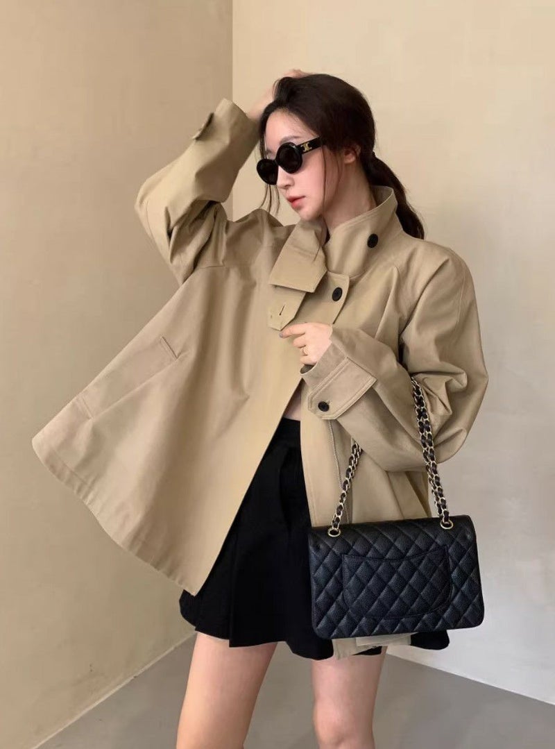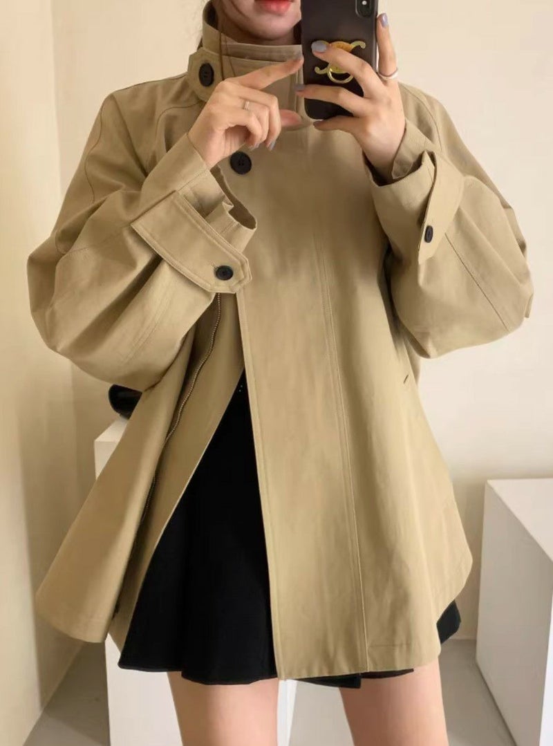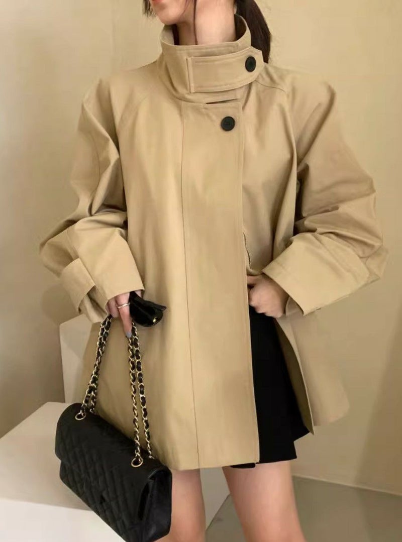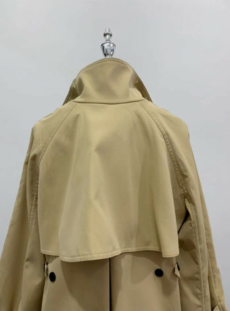 Aラインのフレアとハイカラーがマニッシュなトレンチコート