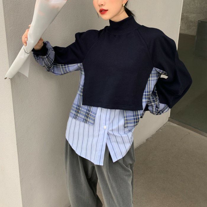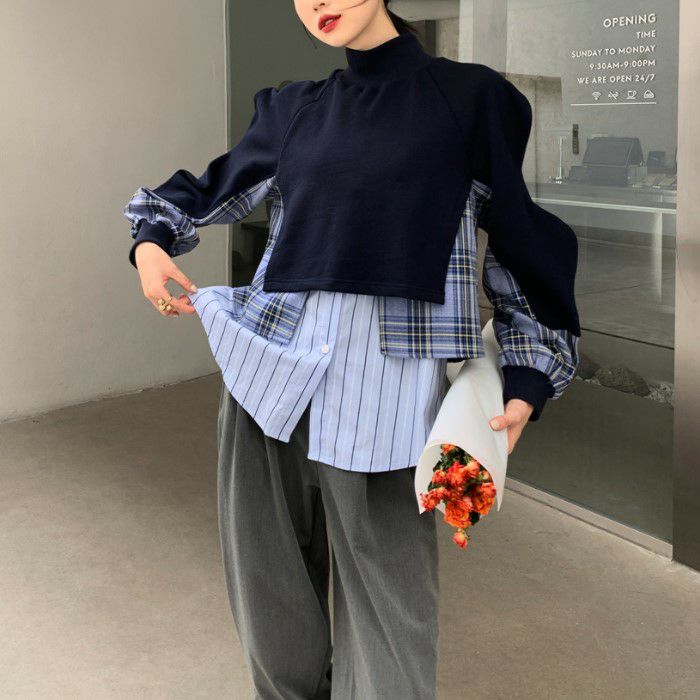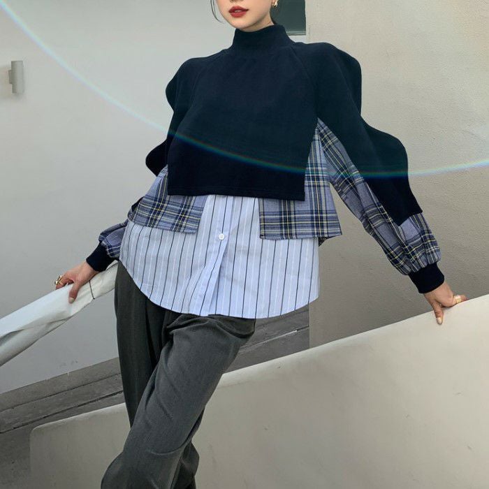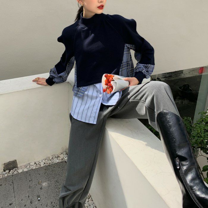 一部即納 4color キルティング ドッキング ハイネック ニット