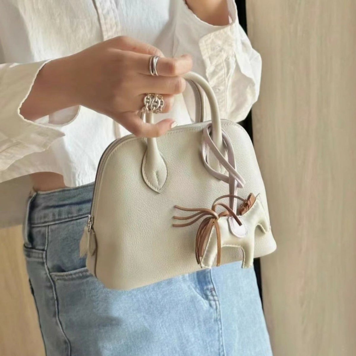 予約 4color リアルレザー リング スカラップ ハンドル バッグ