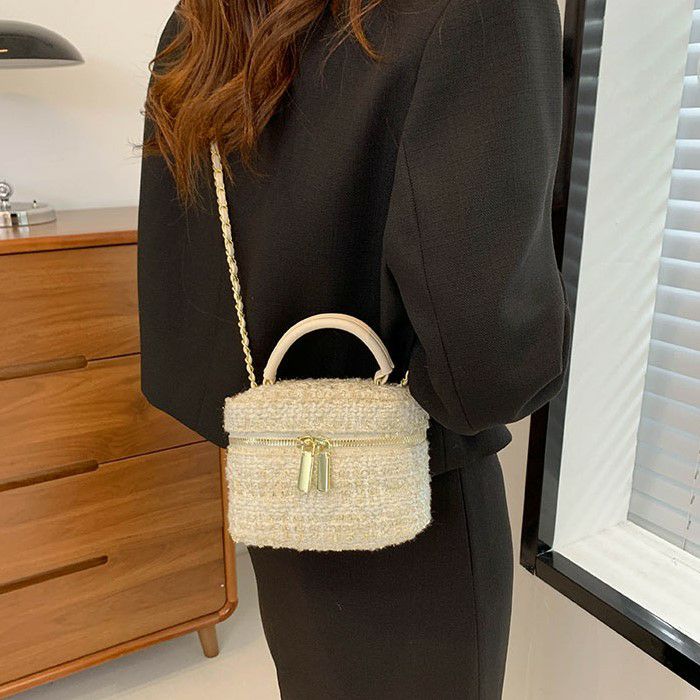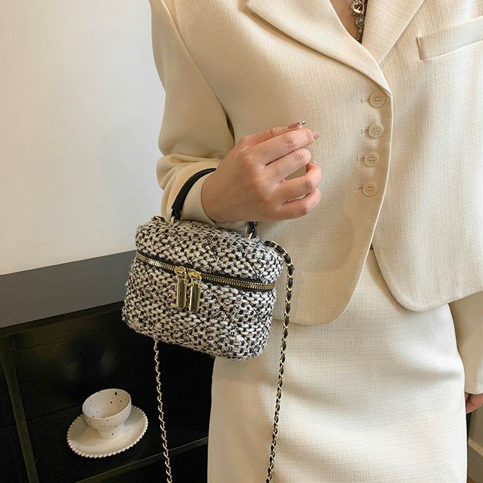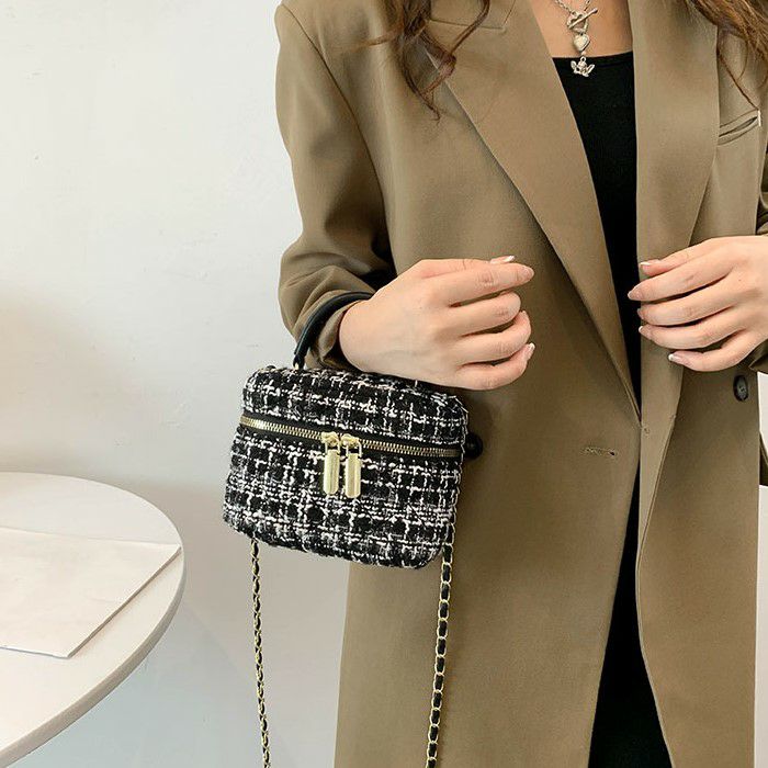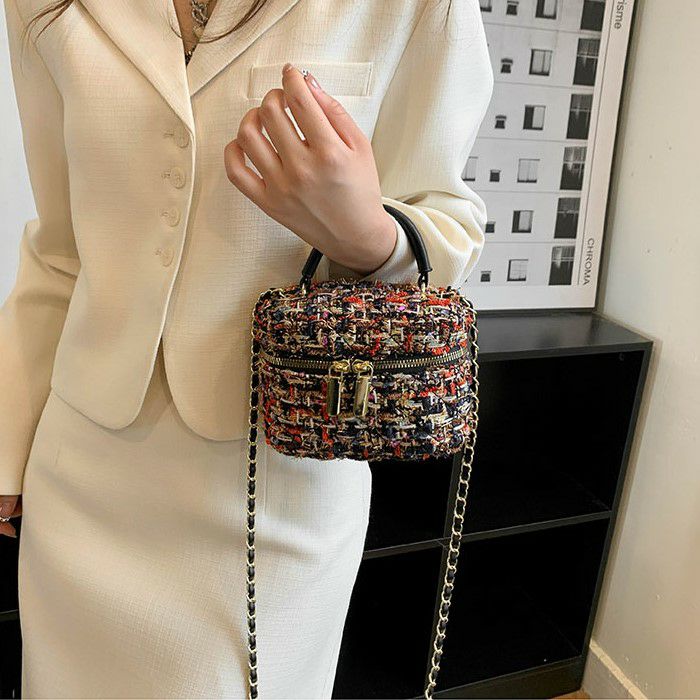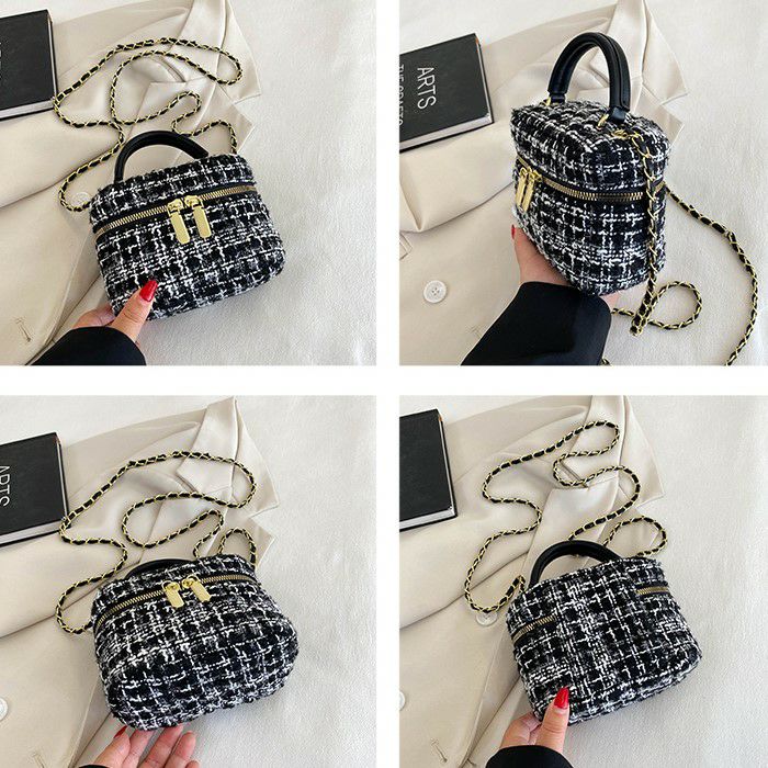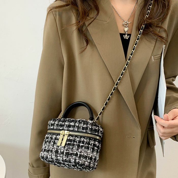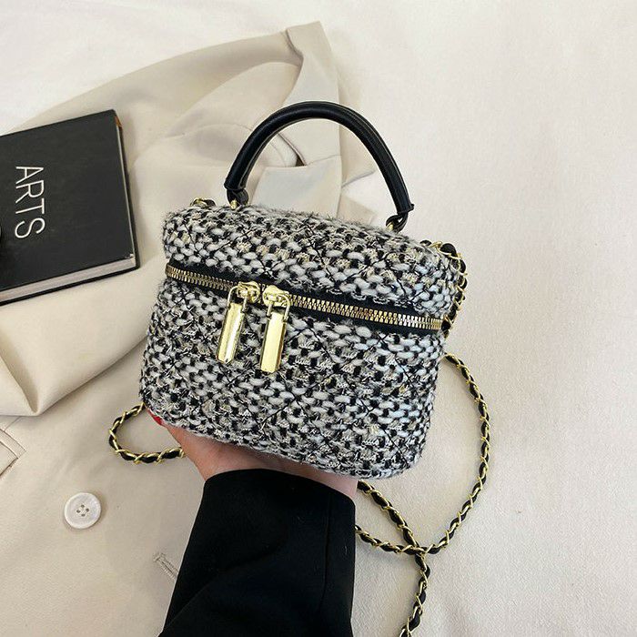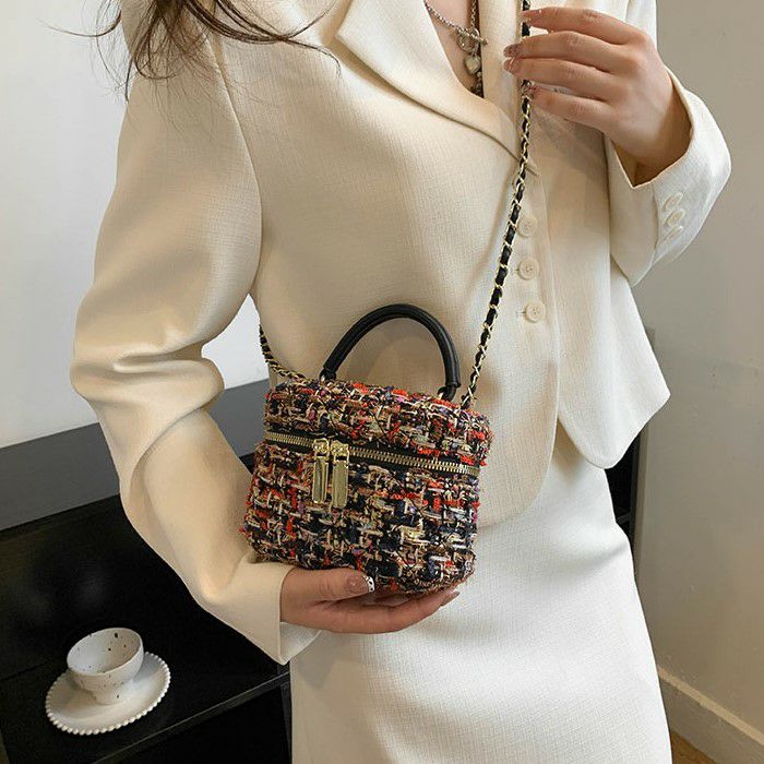 ハンドル付きのツイード生地ミニバニティー
