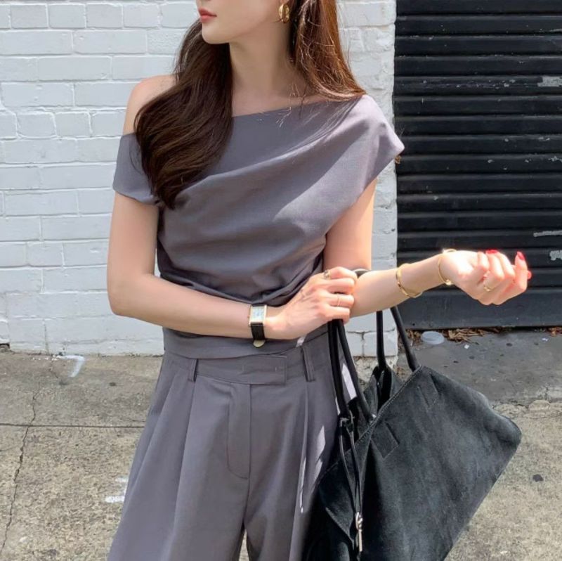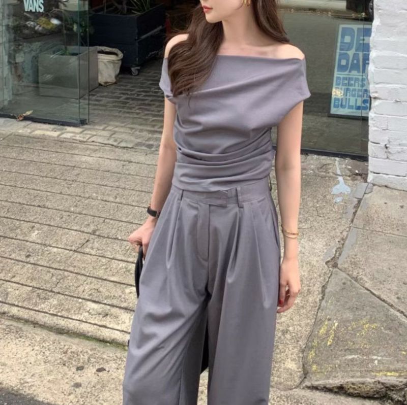 予約 2color オフショルダー ドレープ トップス + ストレート パンツ