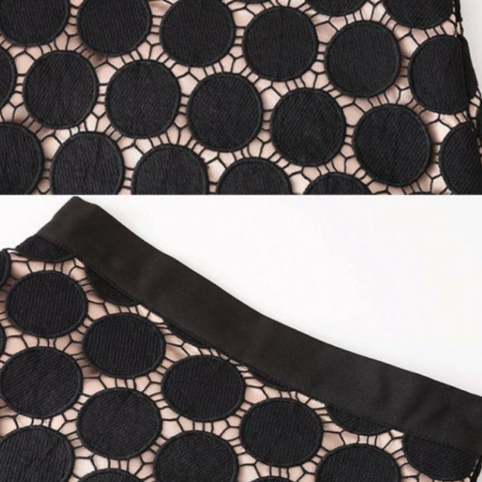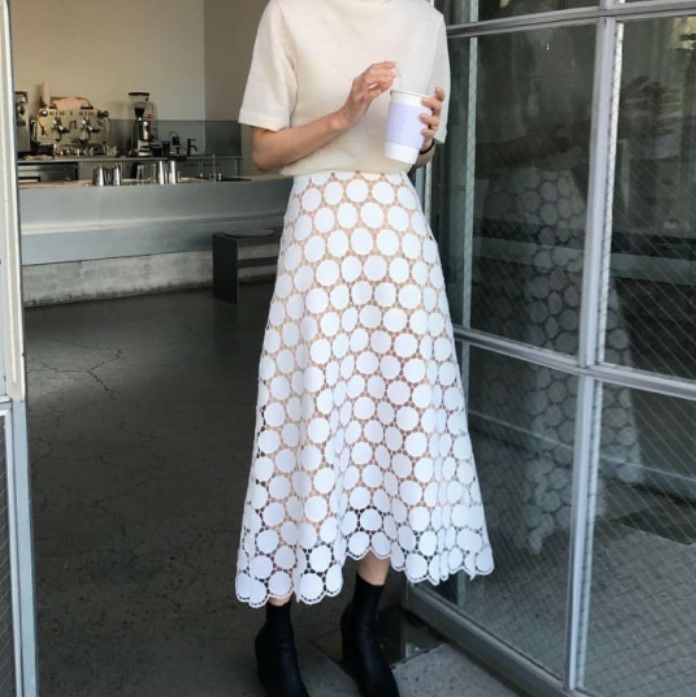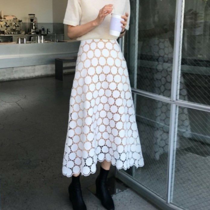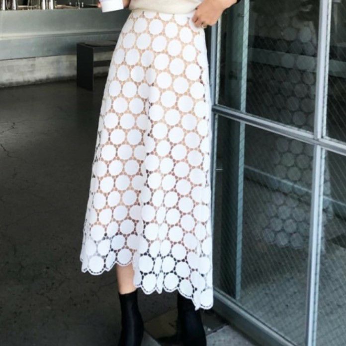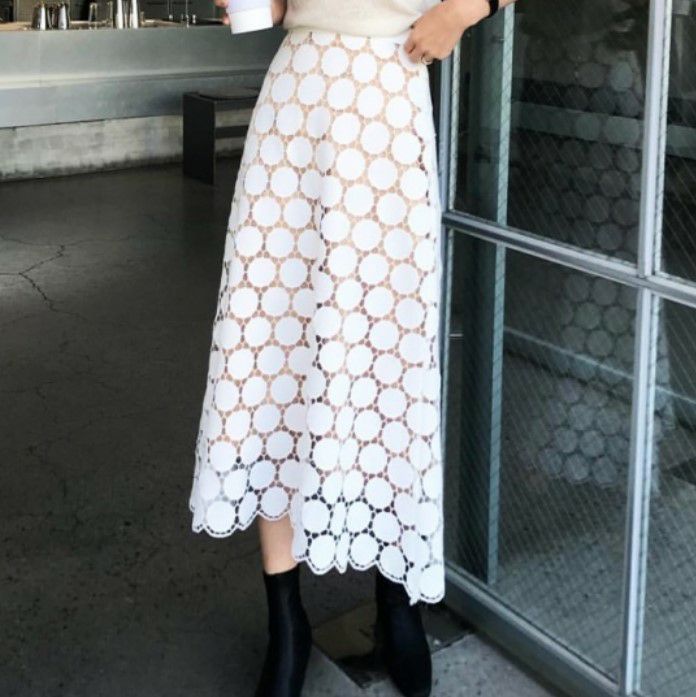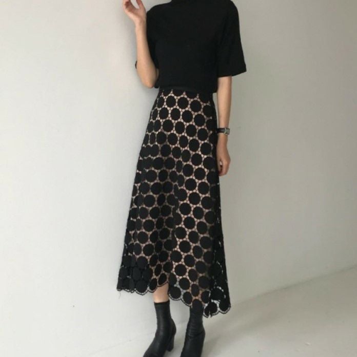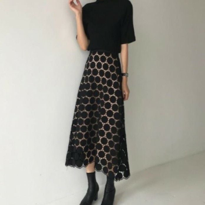 予約 2color レース ビッグドット フレア ロング スカート ボトム シースルー