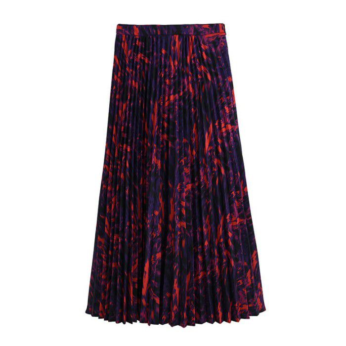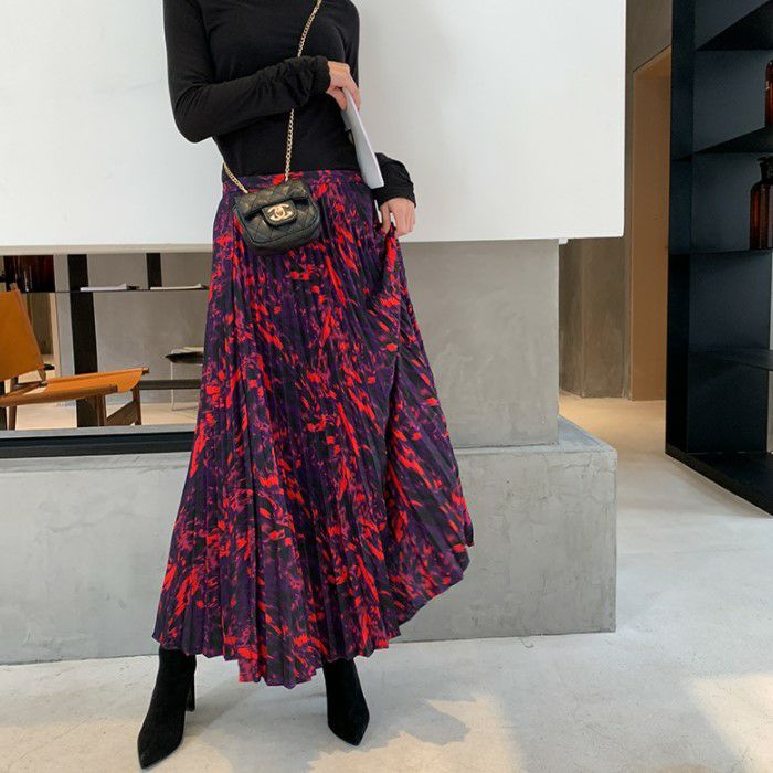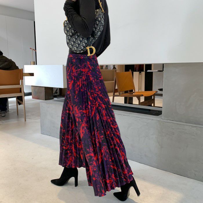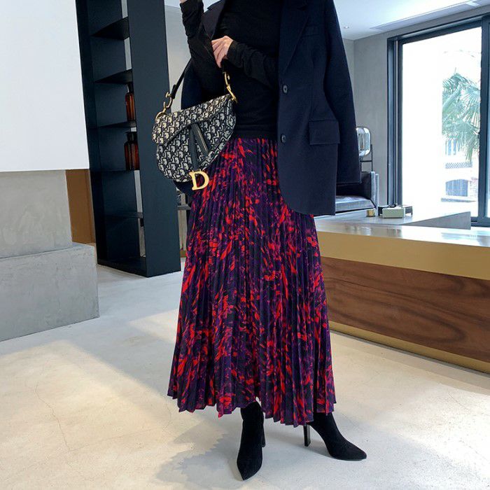 目を引くカラー使いのプリーツロングスカート