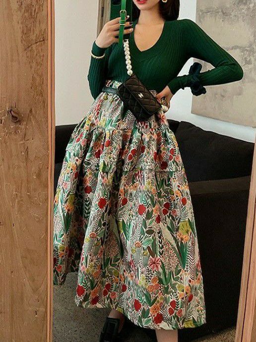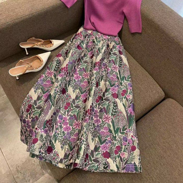カラー使いも可愛い刺繍ロングフレアースカート