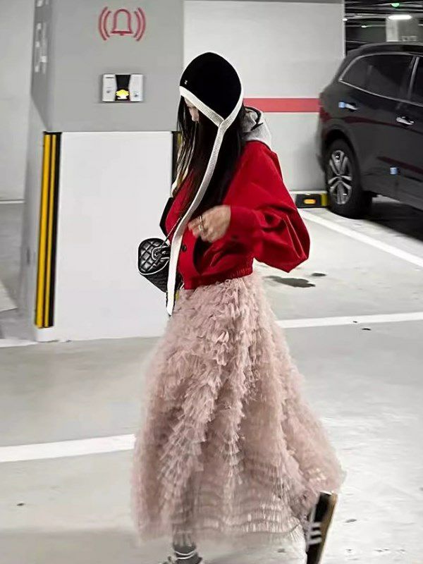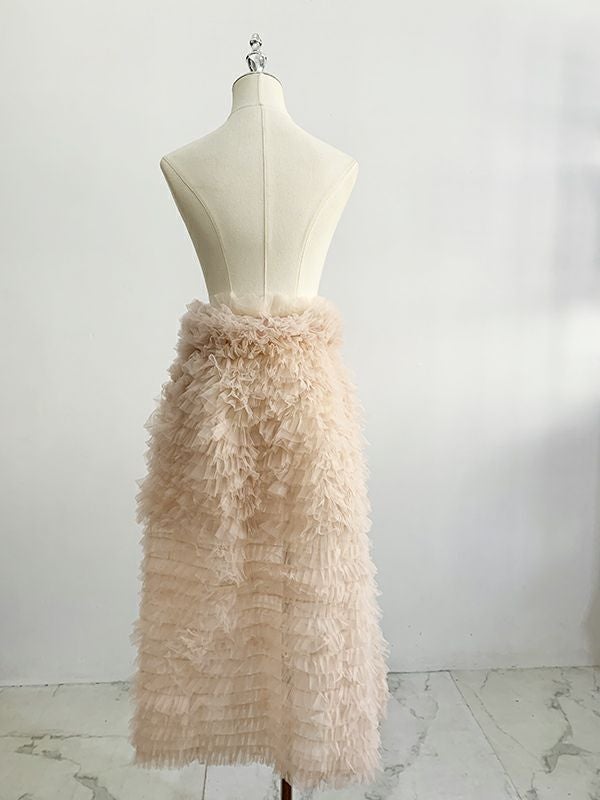 軽やかなチュールを重ねたレイヤードデザインが、動くたびに奥行きのある表情を生むスカート。