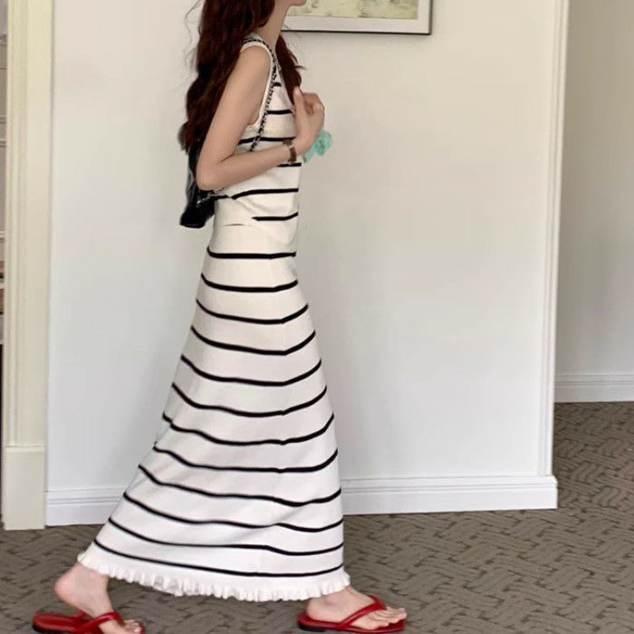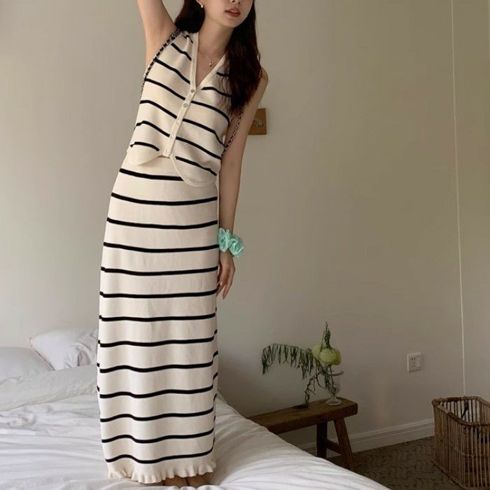 2set ボーダー ニット ジレ セットアップ タイト ロングスカート