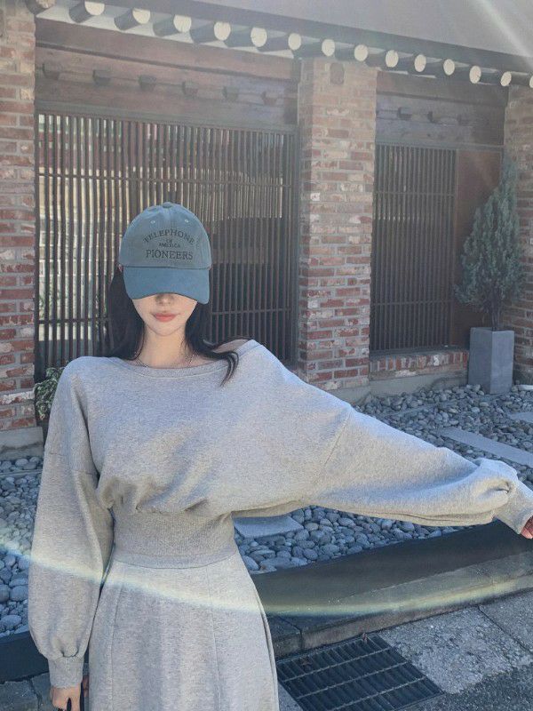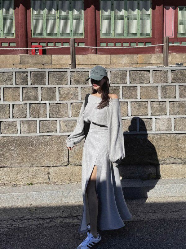 カジュアルな素材の中にオフショルダーやスリットのデザインで女性らしさも。