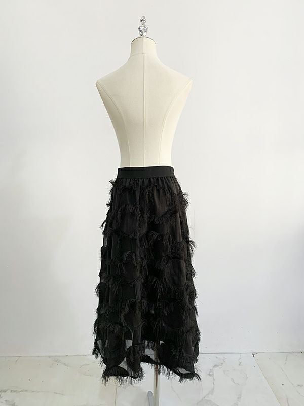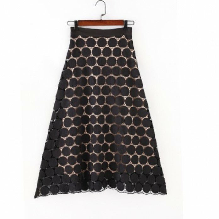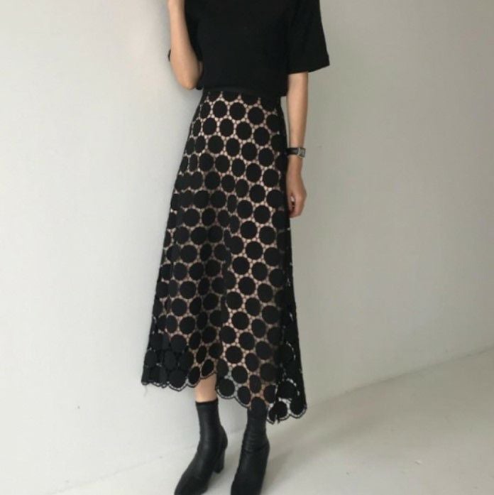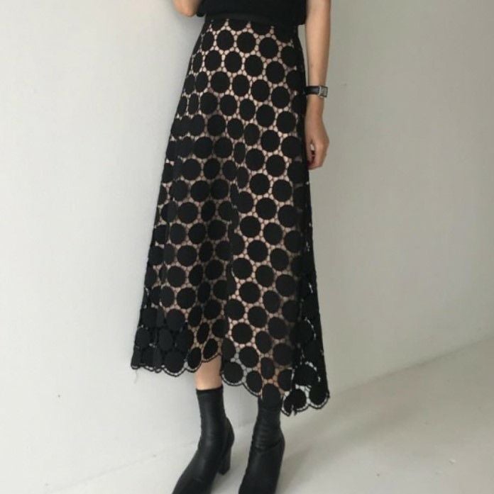 予約 2color レース ビッグドット フレア ロング スカート ボトム シースルー