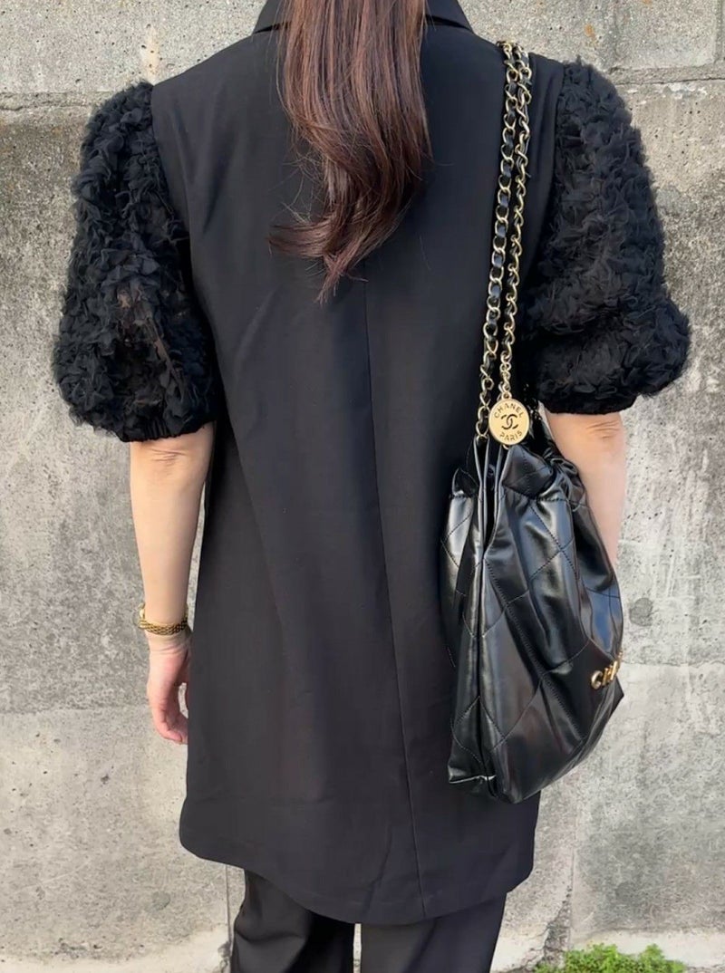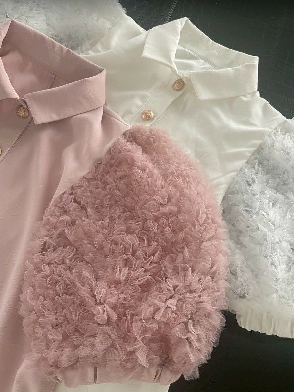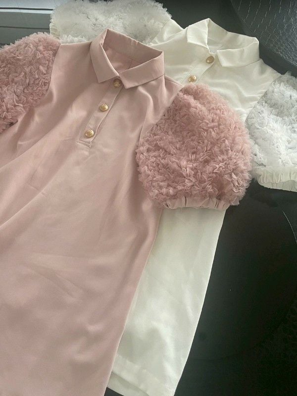 袖が華やかなチュール素材に大きめパフスリーブが印象的。