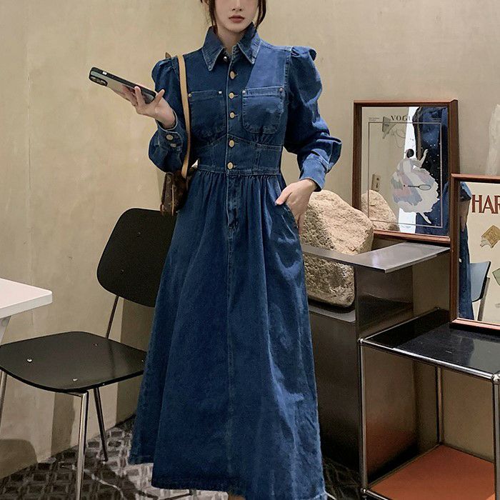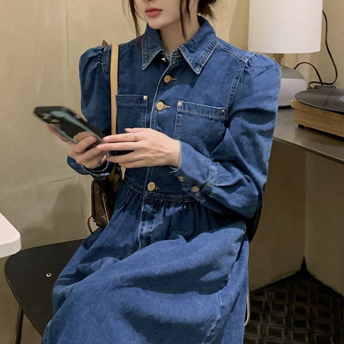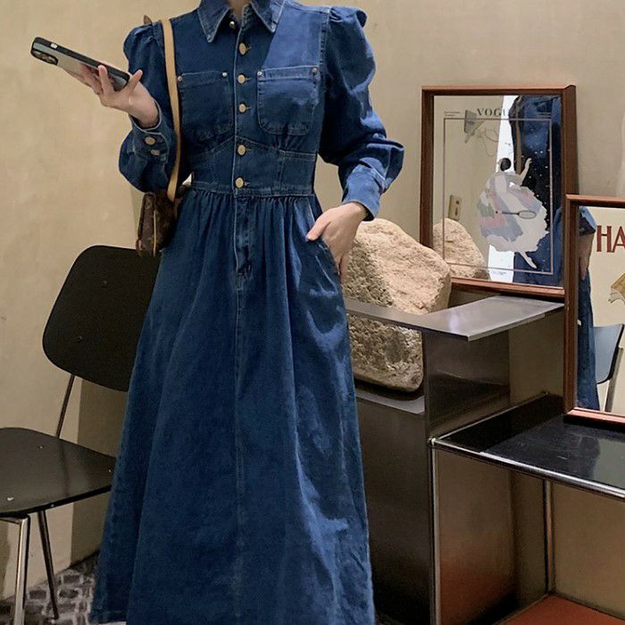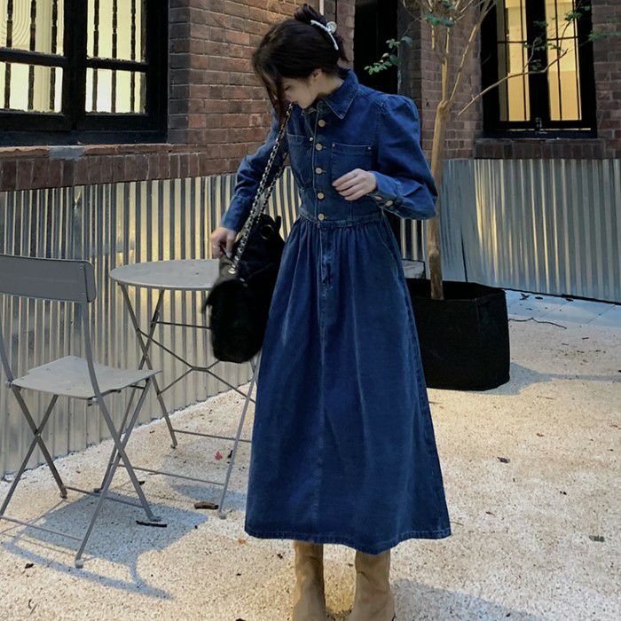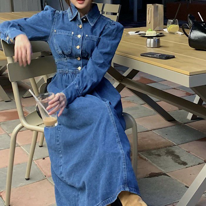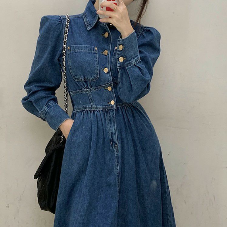 予約 デニム 金ボタン ウエストシェイプ ワンピース