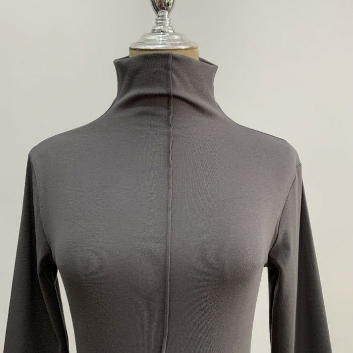 ハイネックのカットソー生地がモードな雰囲気をプラスします。
