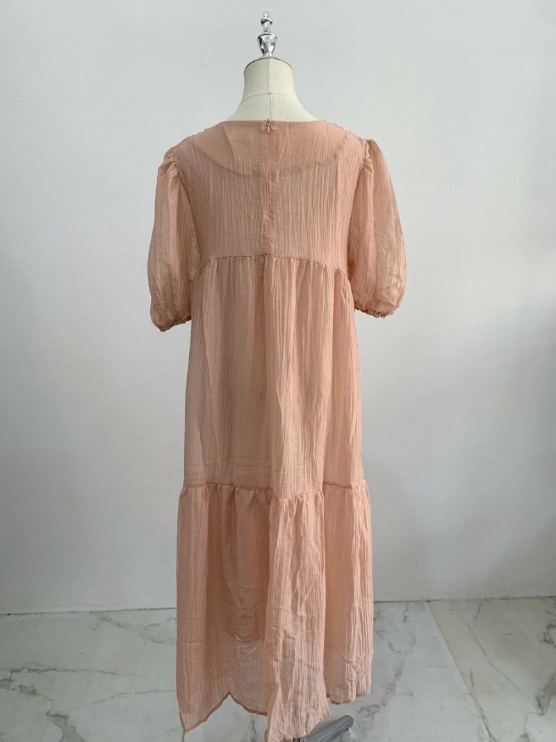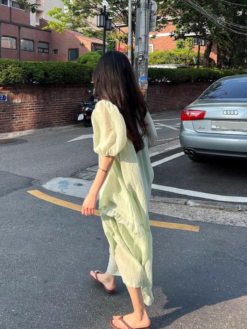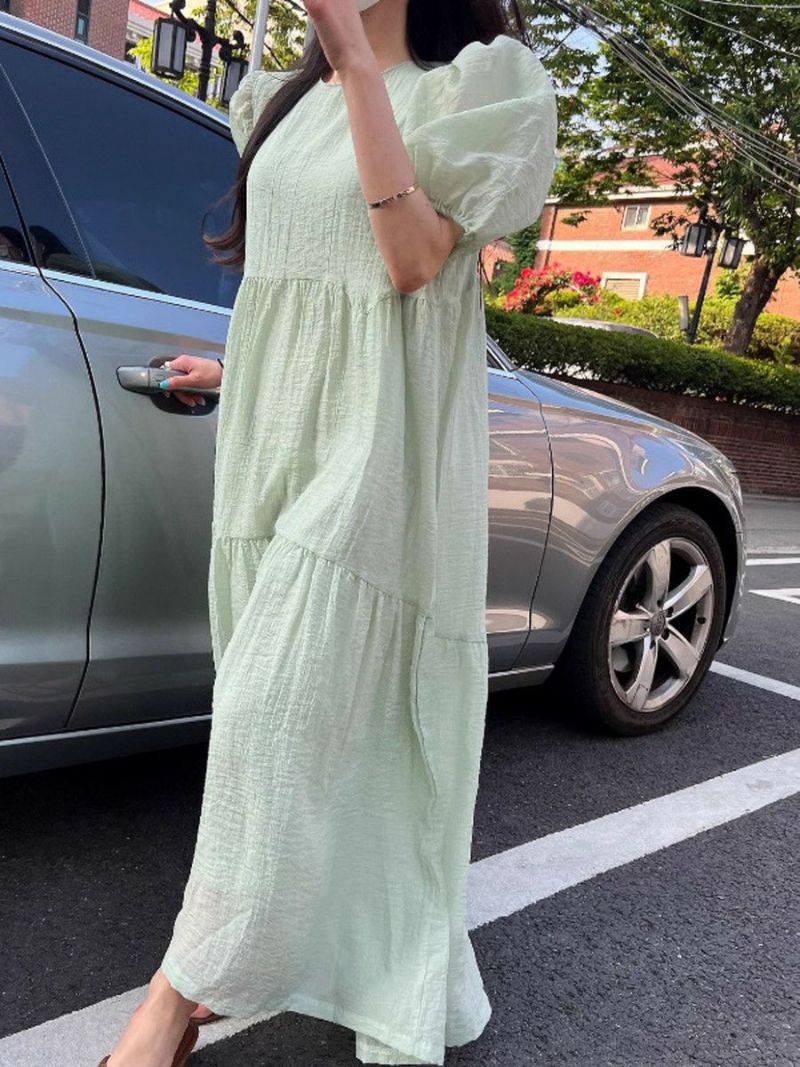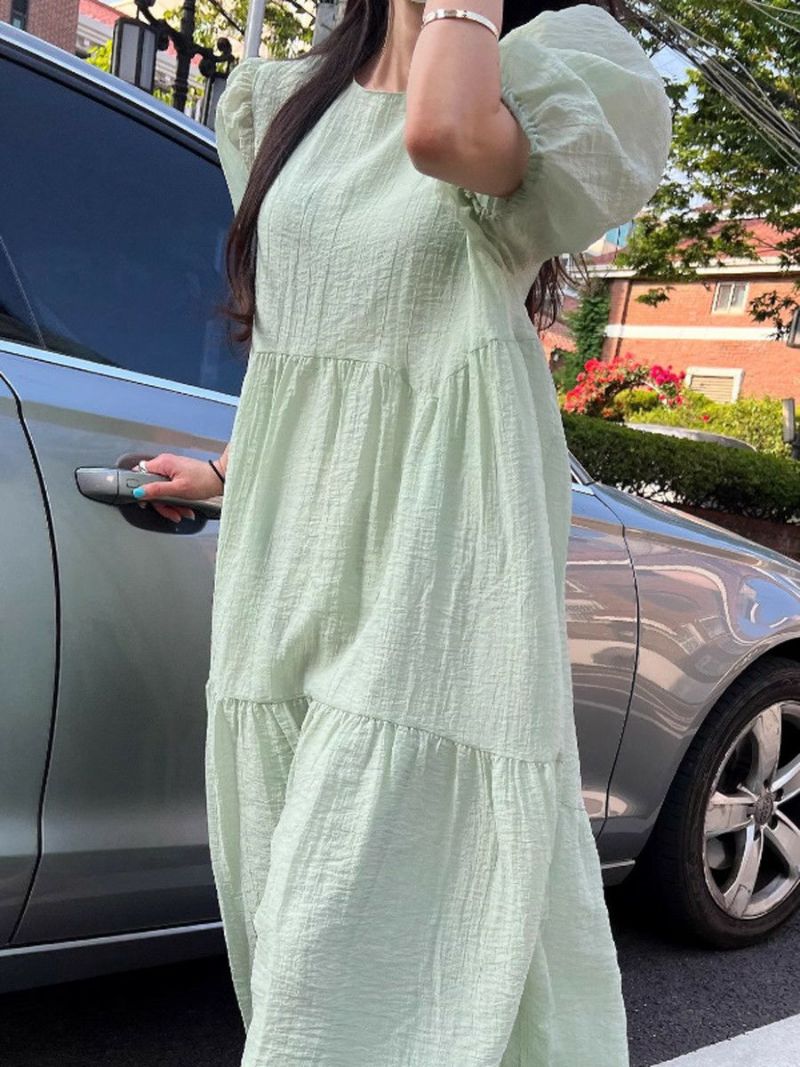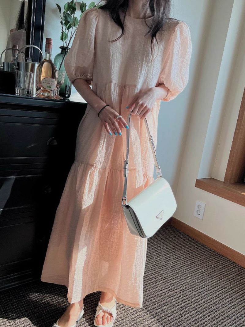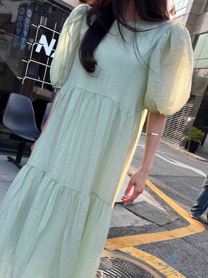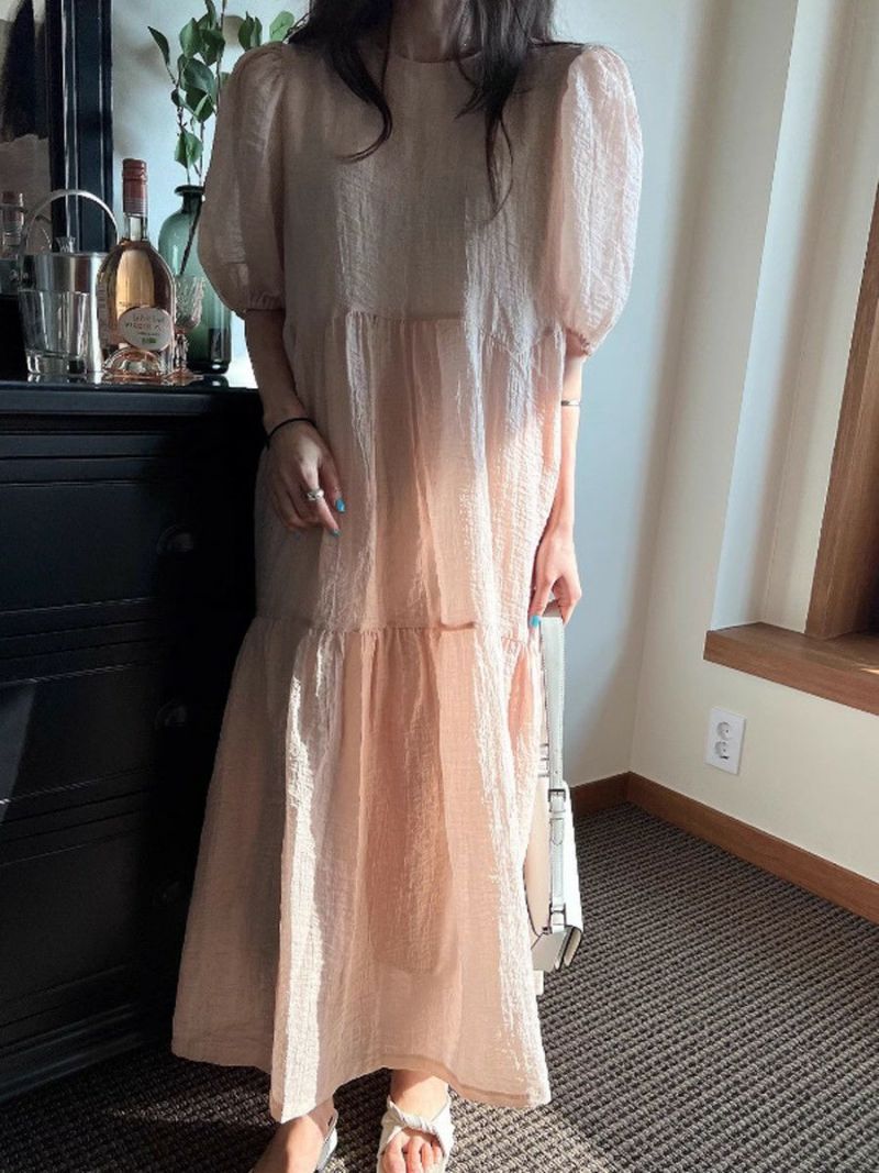 予約 2color シアー ボリューム袖 ティアード シフォン ロング ワンピース