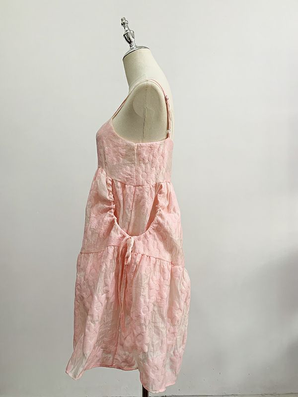 透け感のあるシアー素材に、上品なFlower ジャガード柄が施されたキャミソールミニワンピース。
