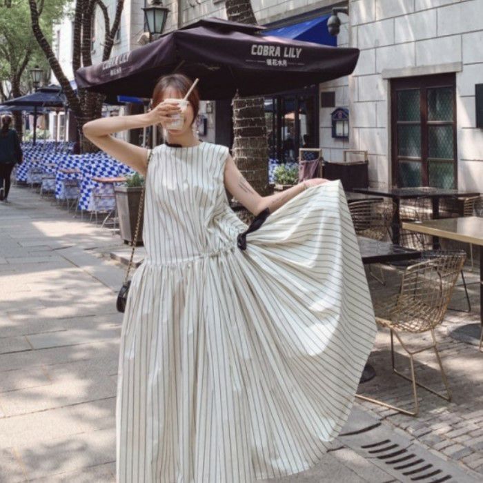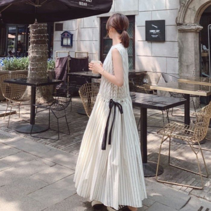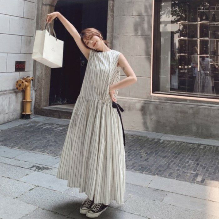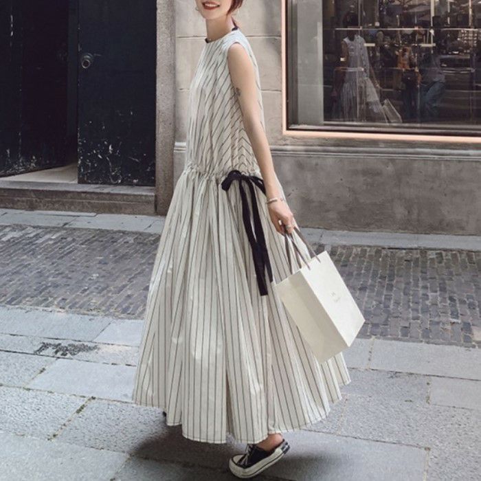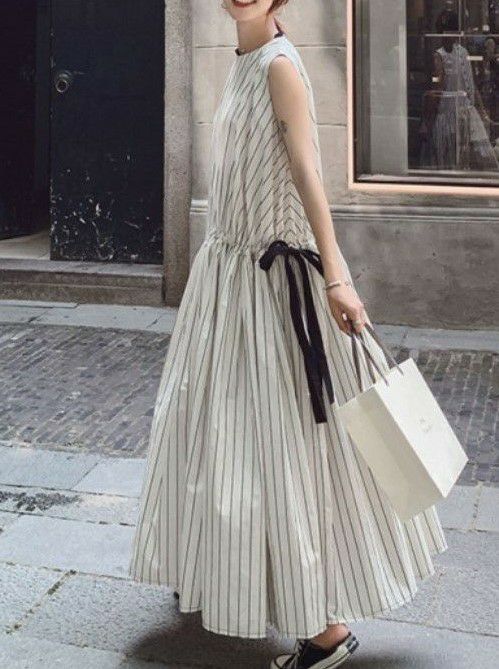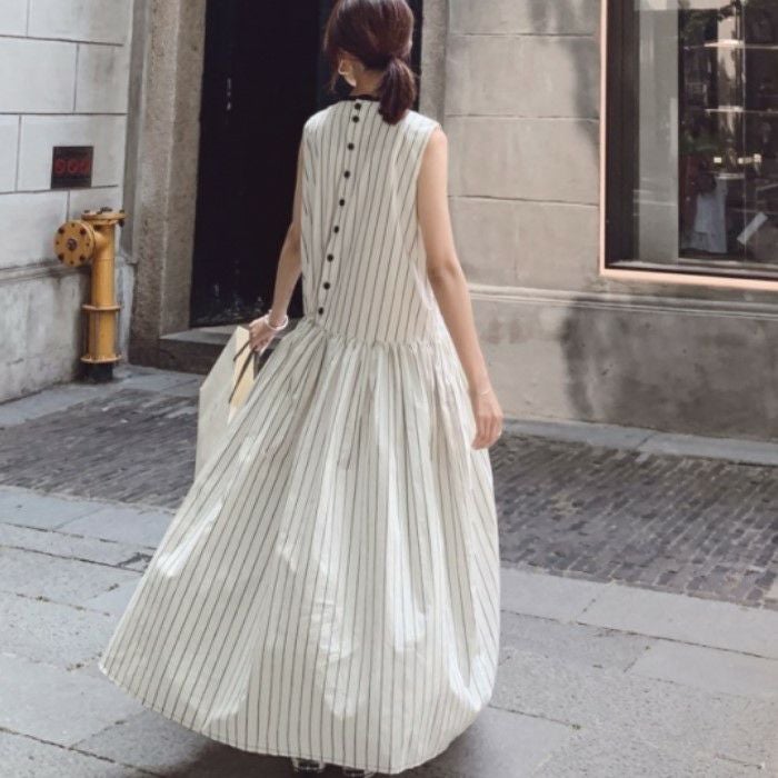 即納 バックボタン ウエストリボン ストライプ マキシワンピース ロングワンピース フレアワンピース