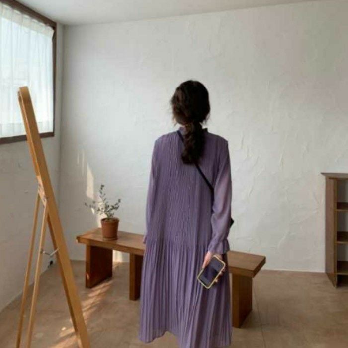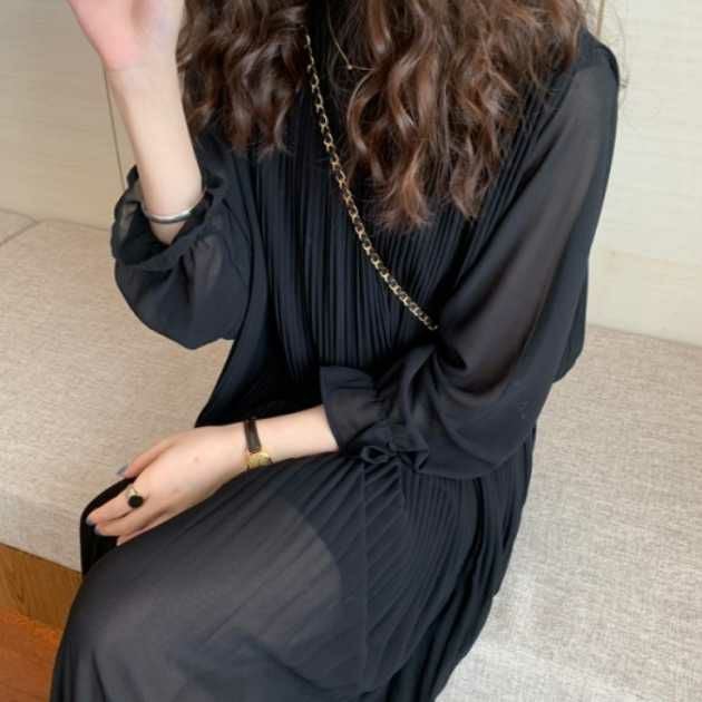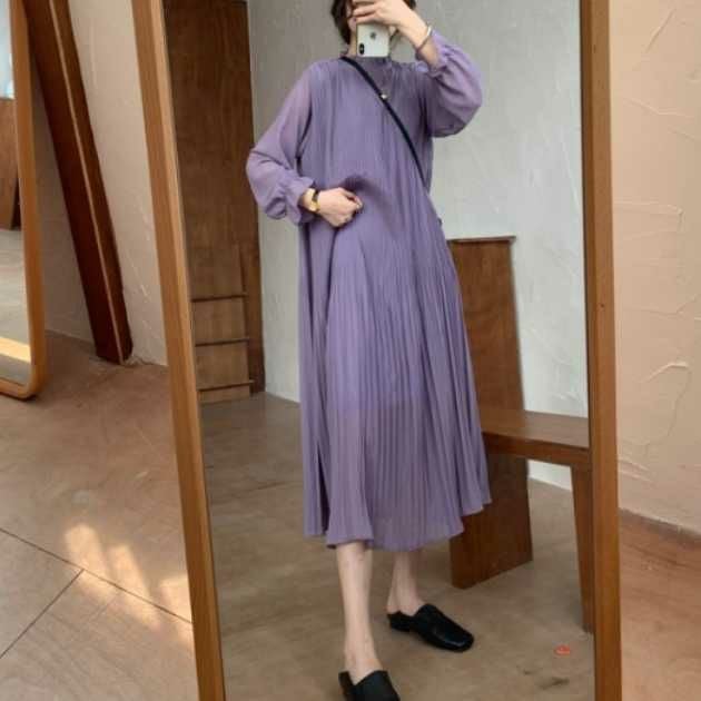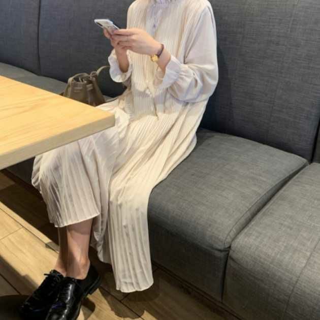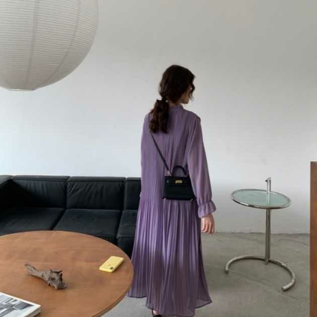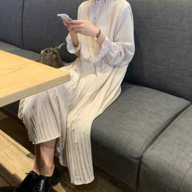 予約 4color シアー袖 キャンディスリーブ フリル スタンドカラー プリーツ ロングワンピース