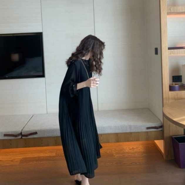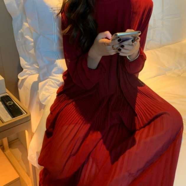 シアーな袖とプリーツのドッキングワンピース。