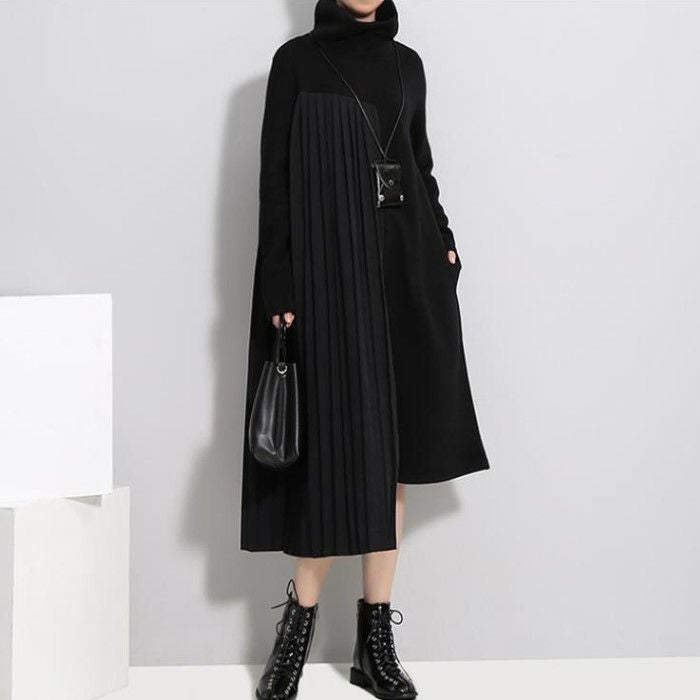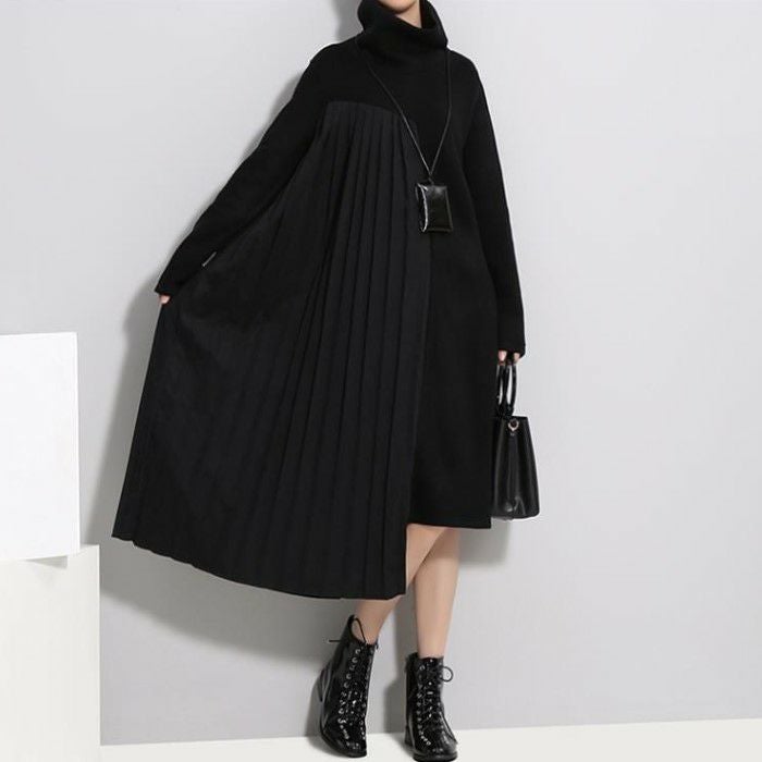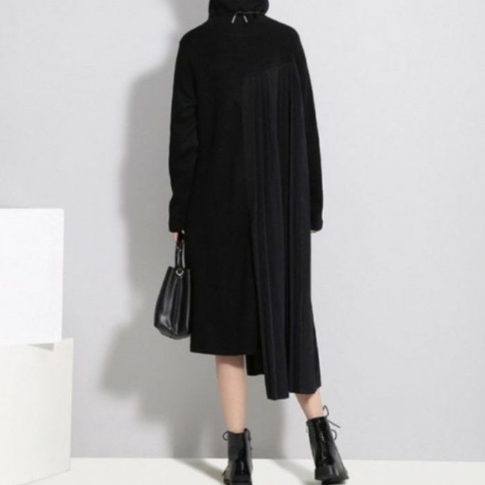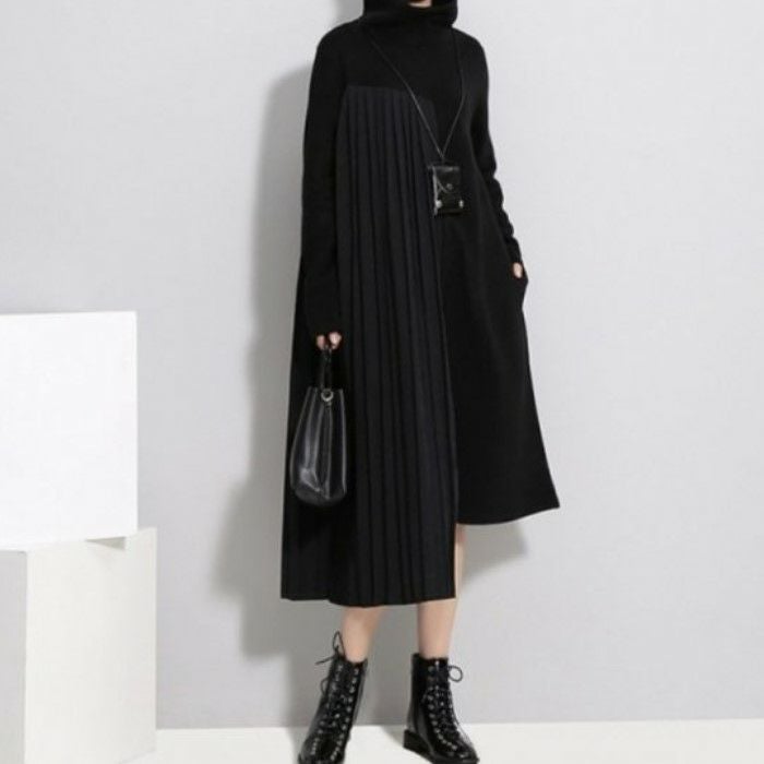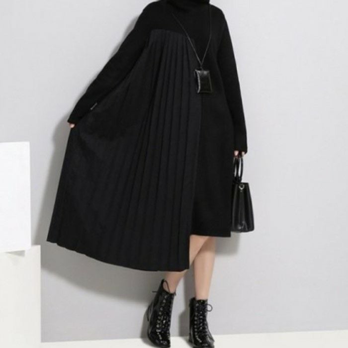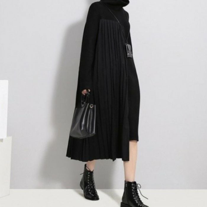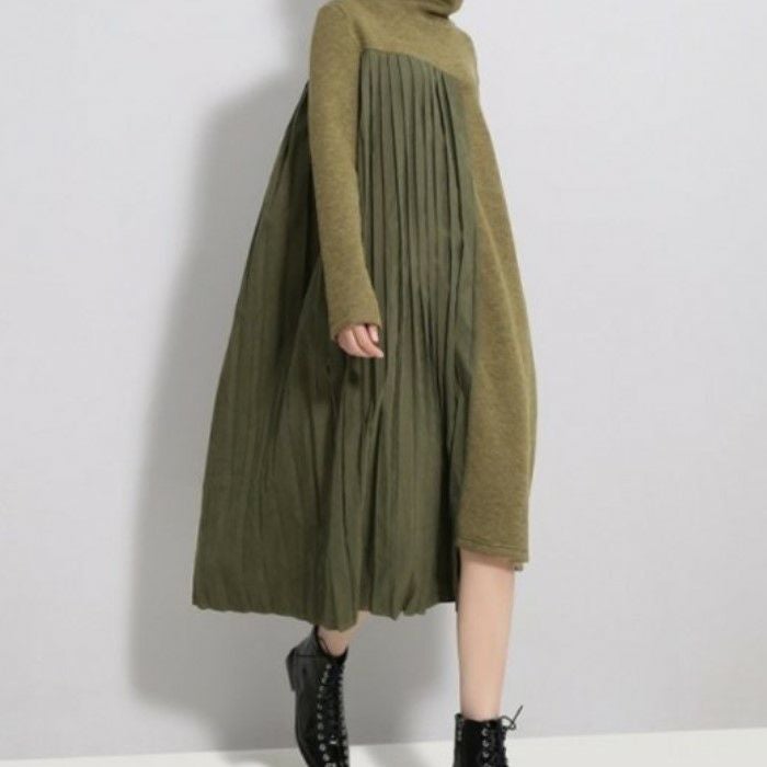 即納 2color ハイネック サイド プリーツ ニット ドッキング ワンピース