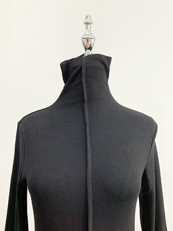 ハイネックのカットソー生地がモードな雰囲気をプラスします。
