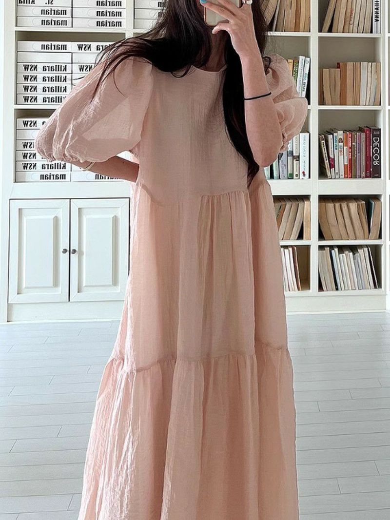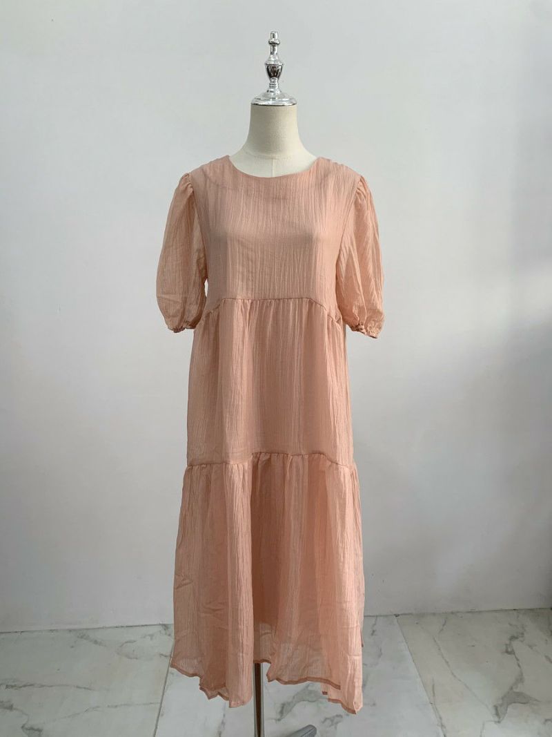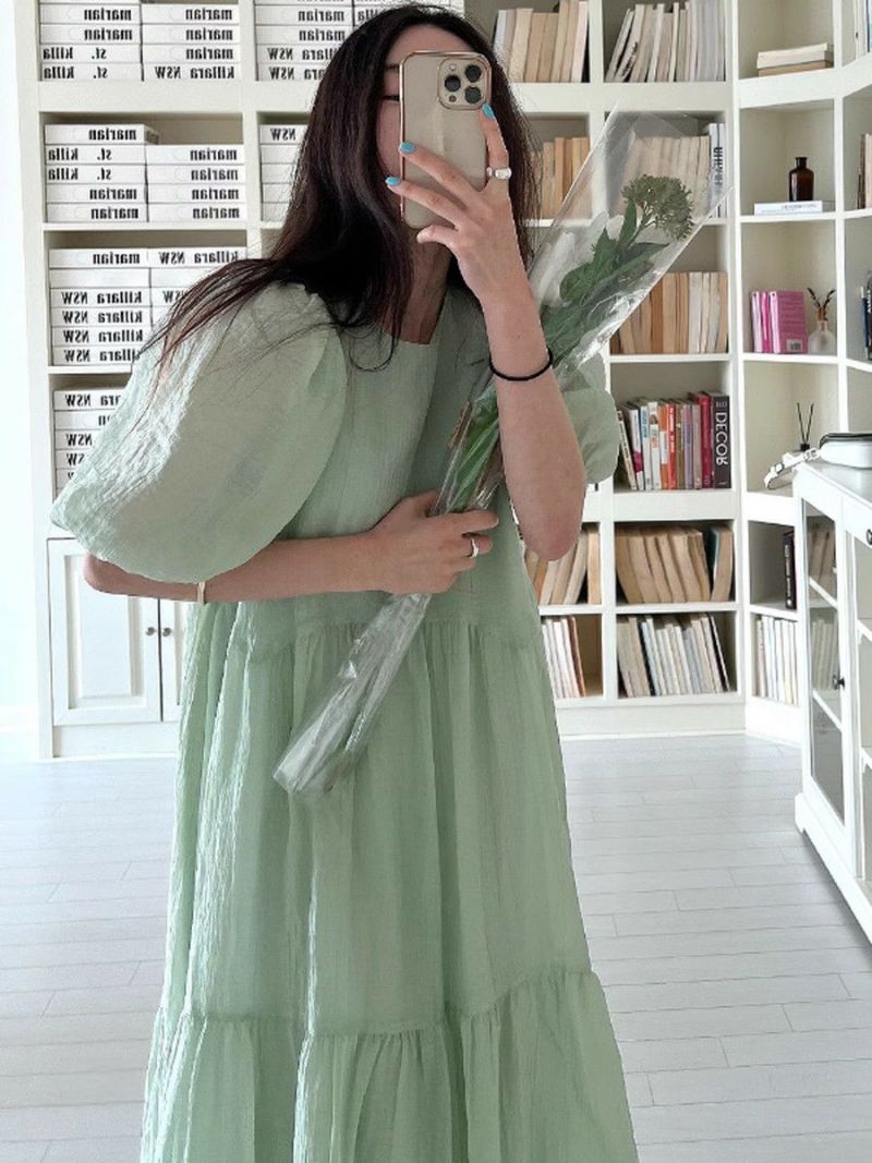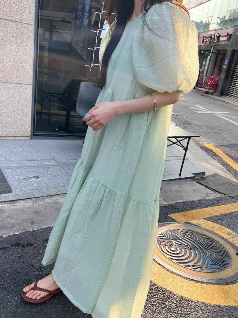 予約 2color シアー ボリューム袖 ティアード シフォン ロング ワンピース