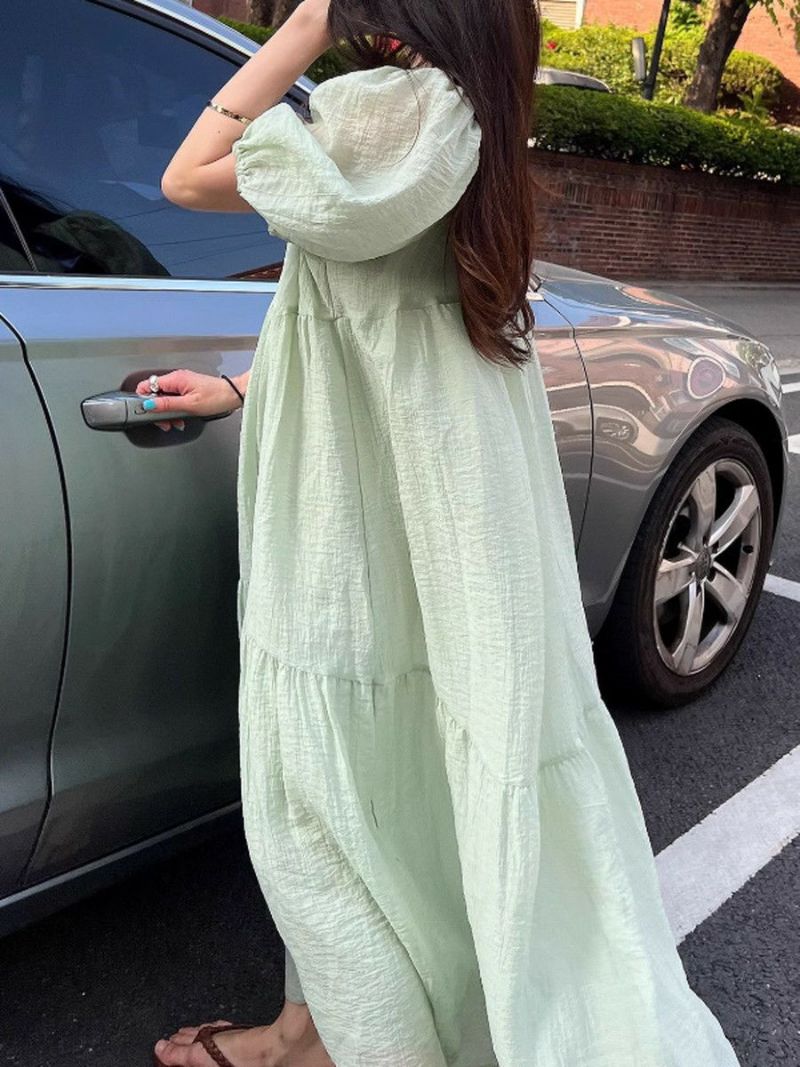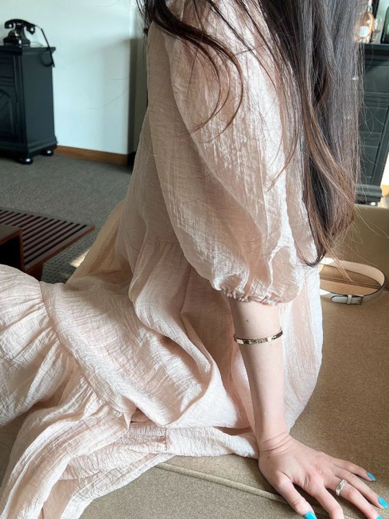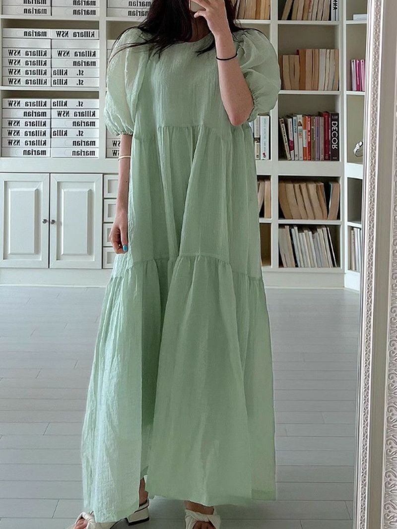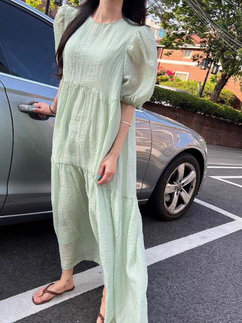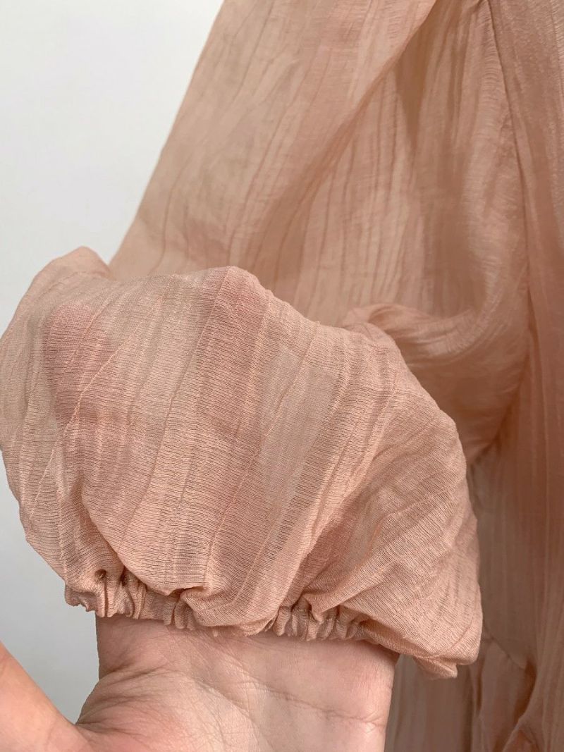予約 2color シアー ボリューム袖 ティアード シフォン ロング ワンピース
