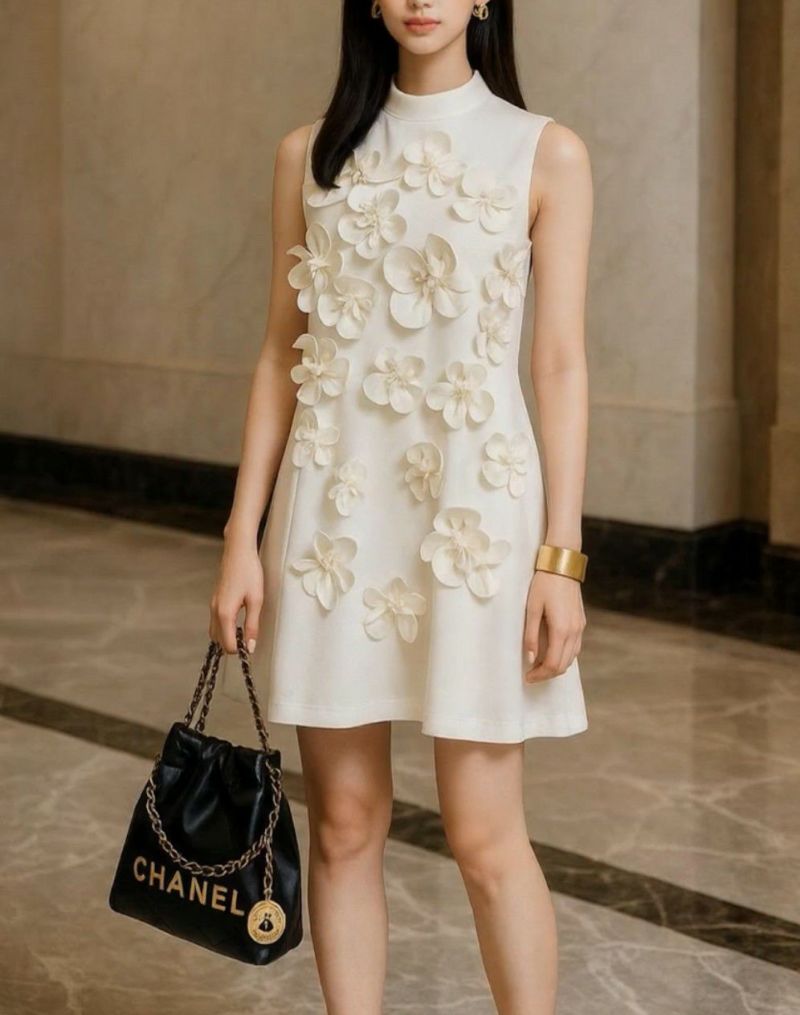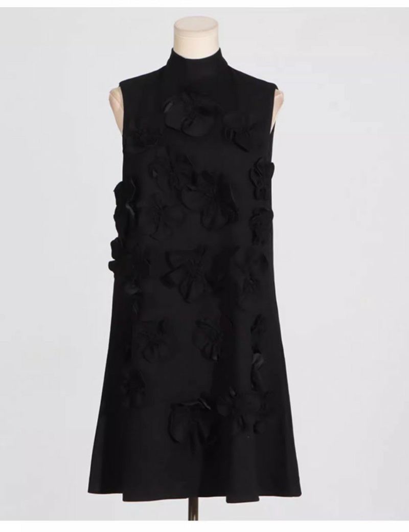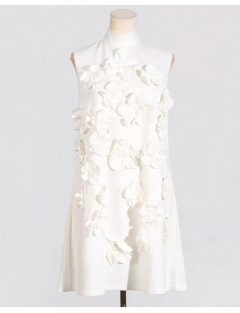 立体的なフラワーデザインが目を惹く、華やかで存在感のあるミニワンピース。