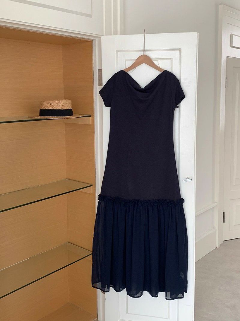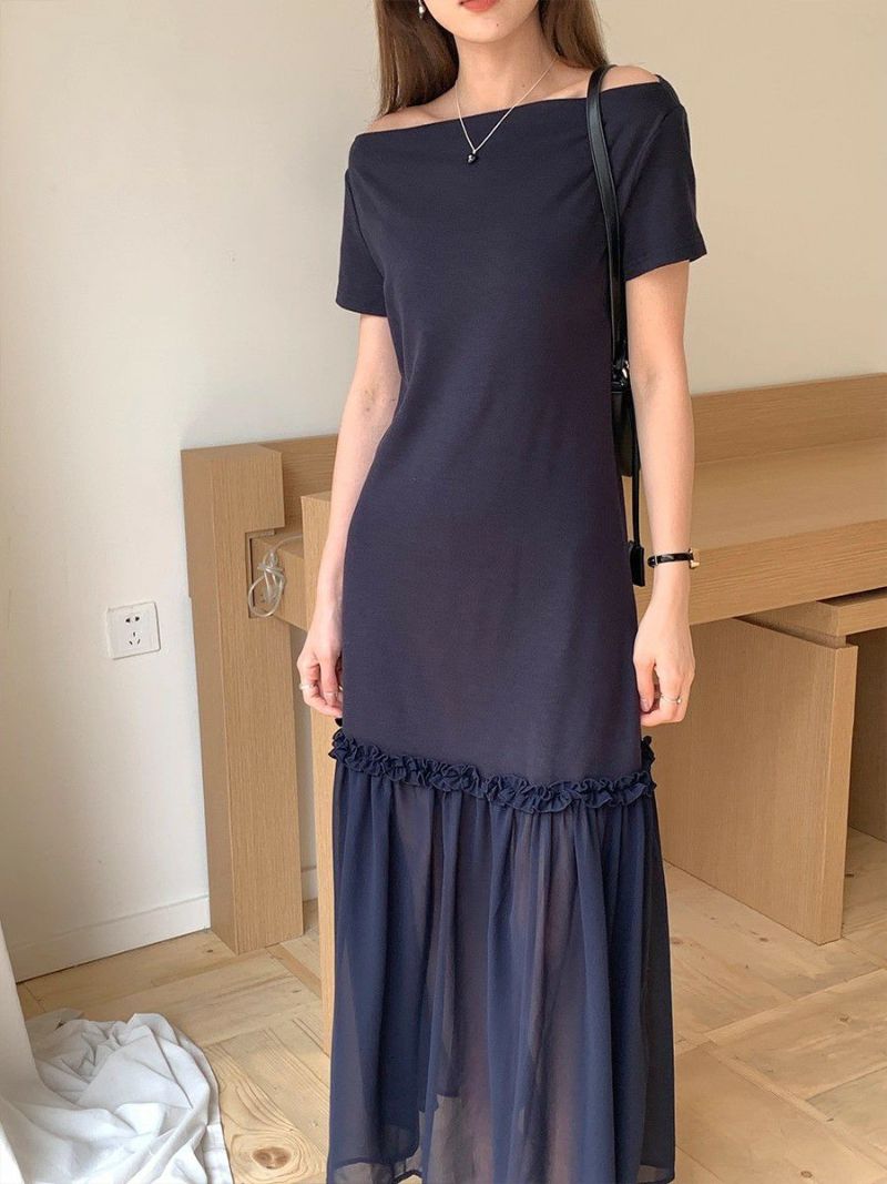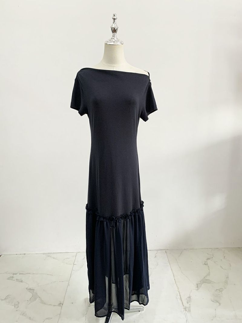 予約 オフショルダー シフォン切替 ロング ワンピース