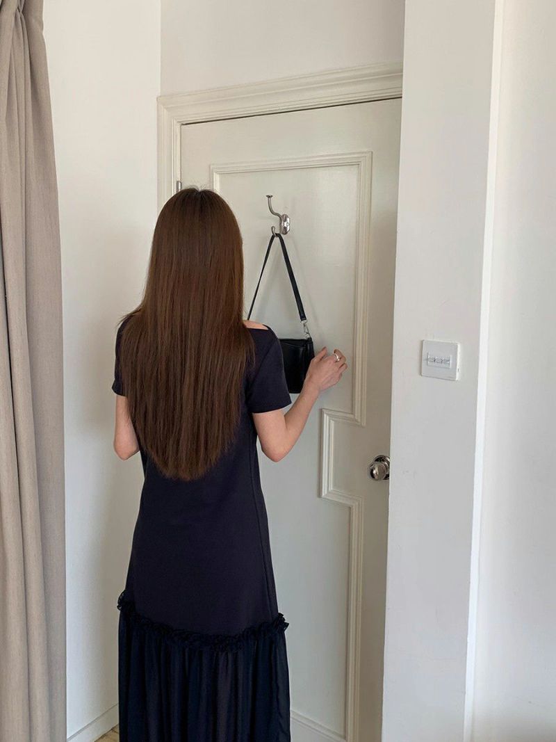 華やかなシフォンの切替部分にはフリルが施され、女性らしいフェミニンな印象を与えます。