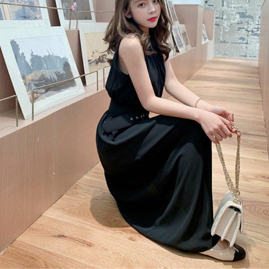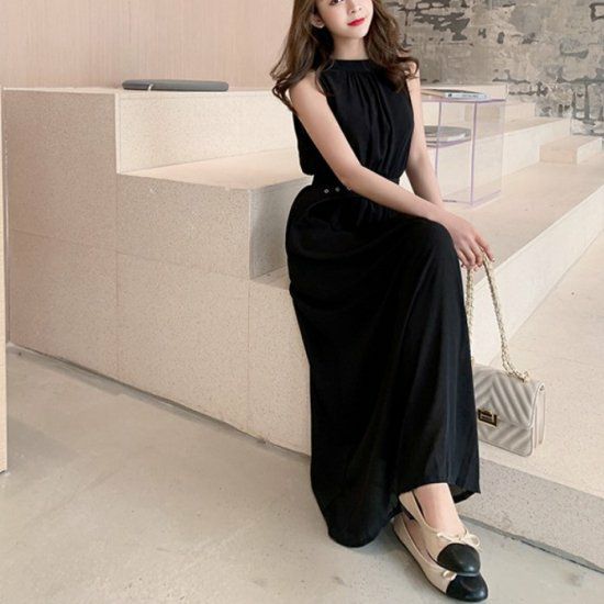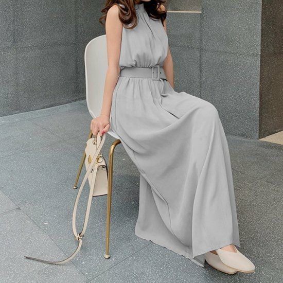 予約* 2color ロング丈 ウエストベルト シフォン ワンピース