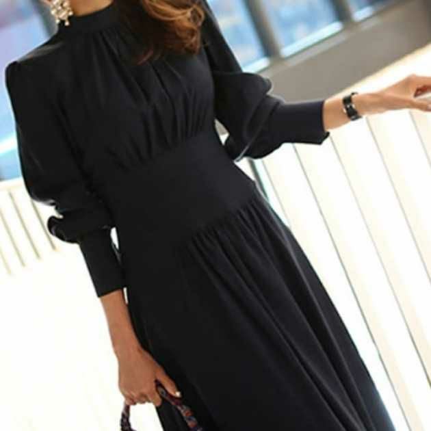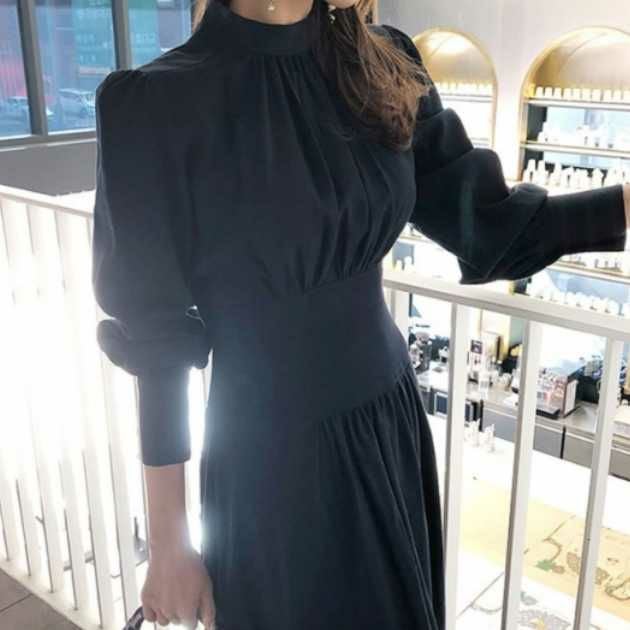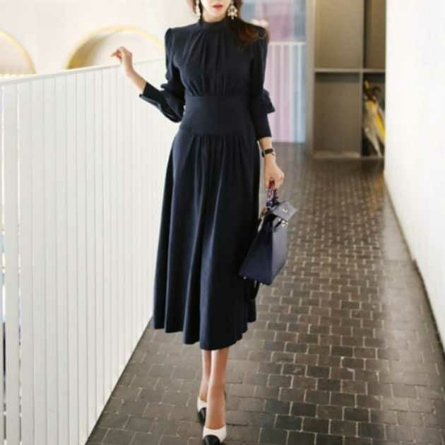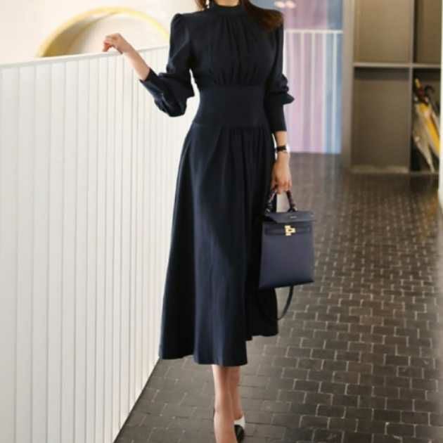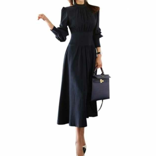 予約* クラシカル ハイネック ウエストリブ ワンピース ロング丈