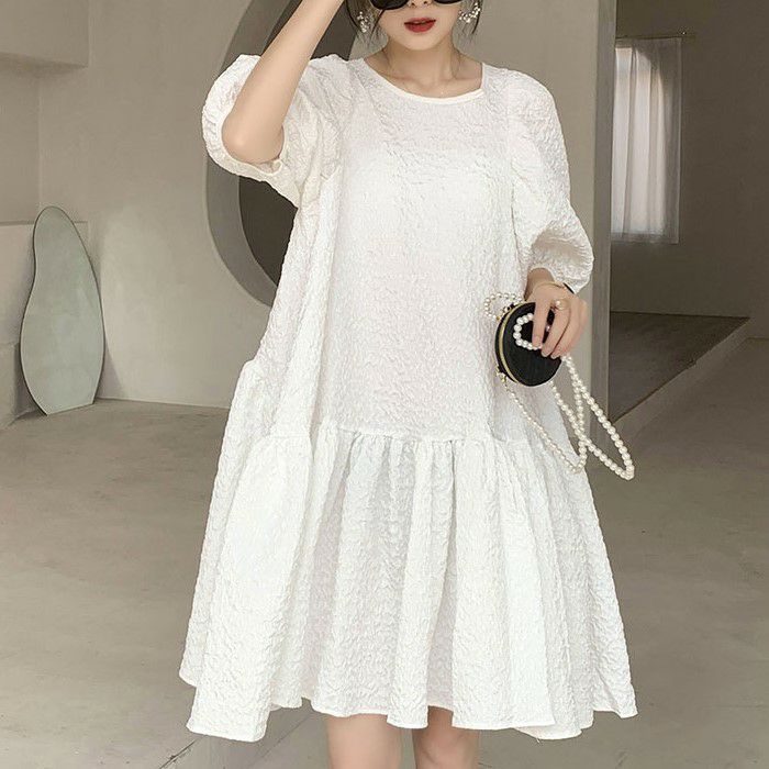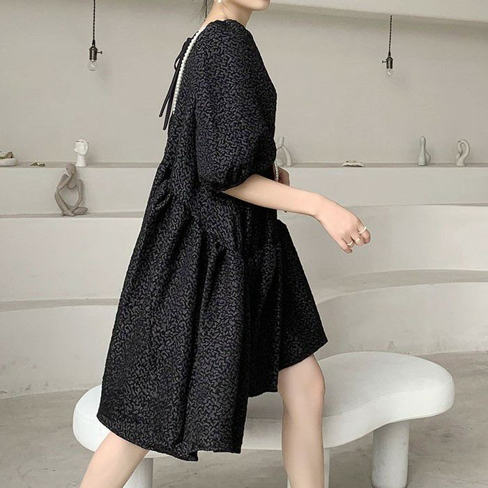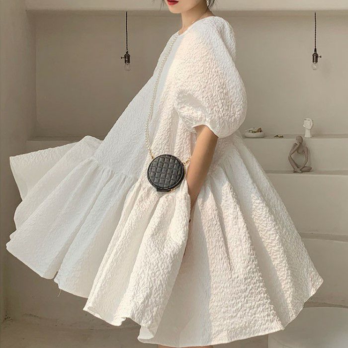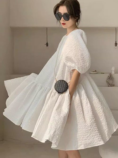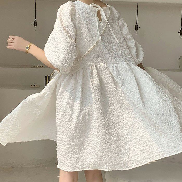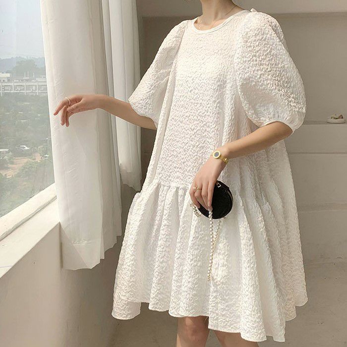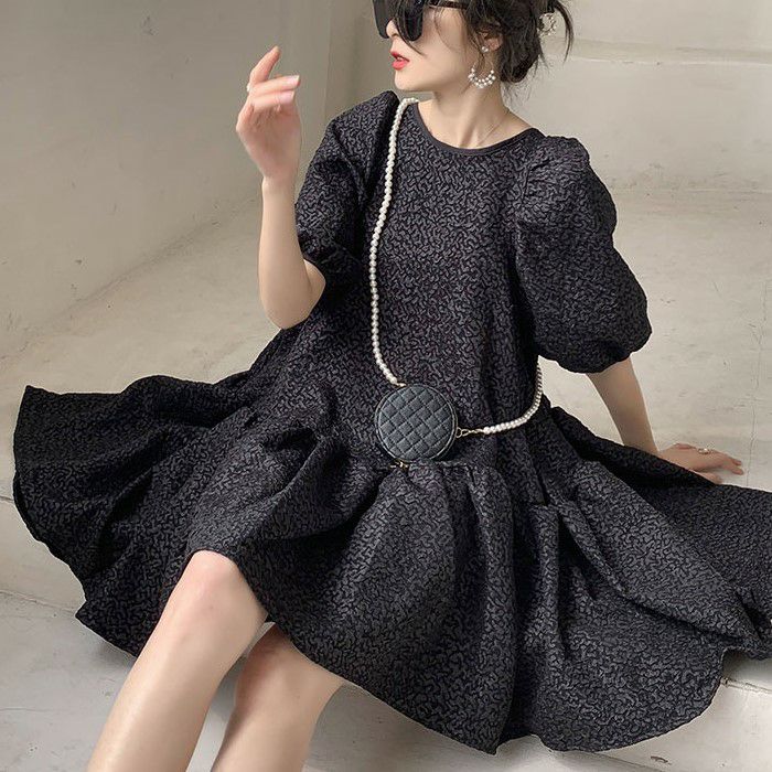 予約 2color バルーンスリーブ ハイウエスト Aライン ワンピース