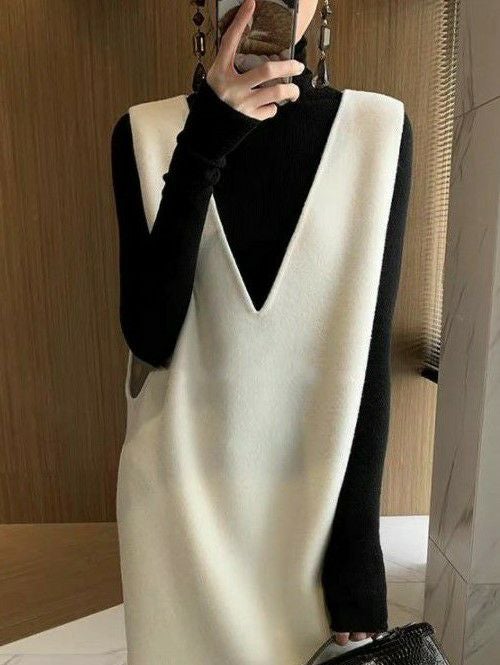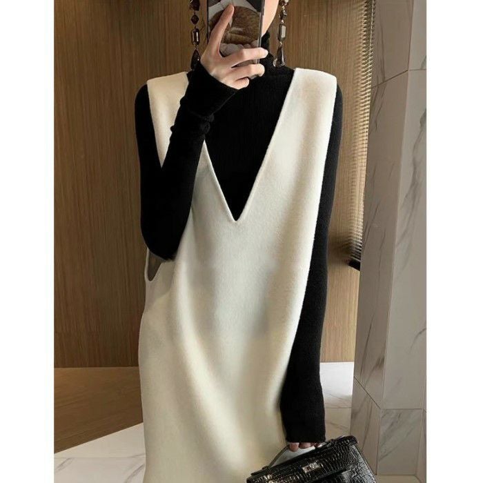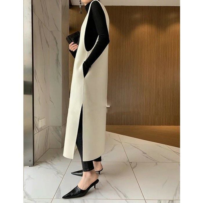 即納 フリースウール スリット ロング Vネック スリーブレス ワンピース