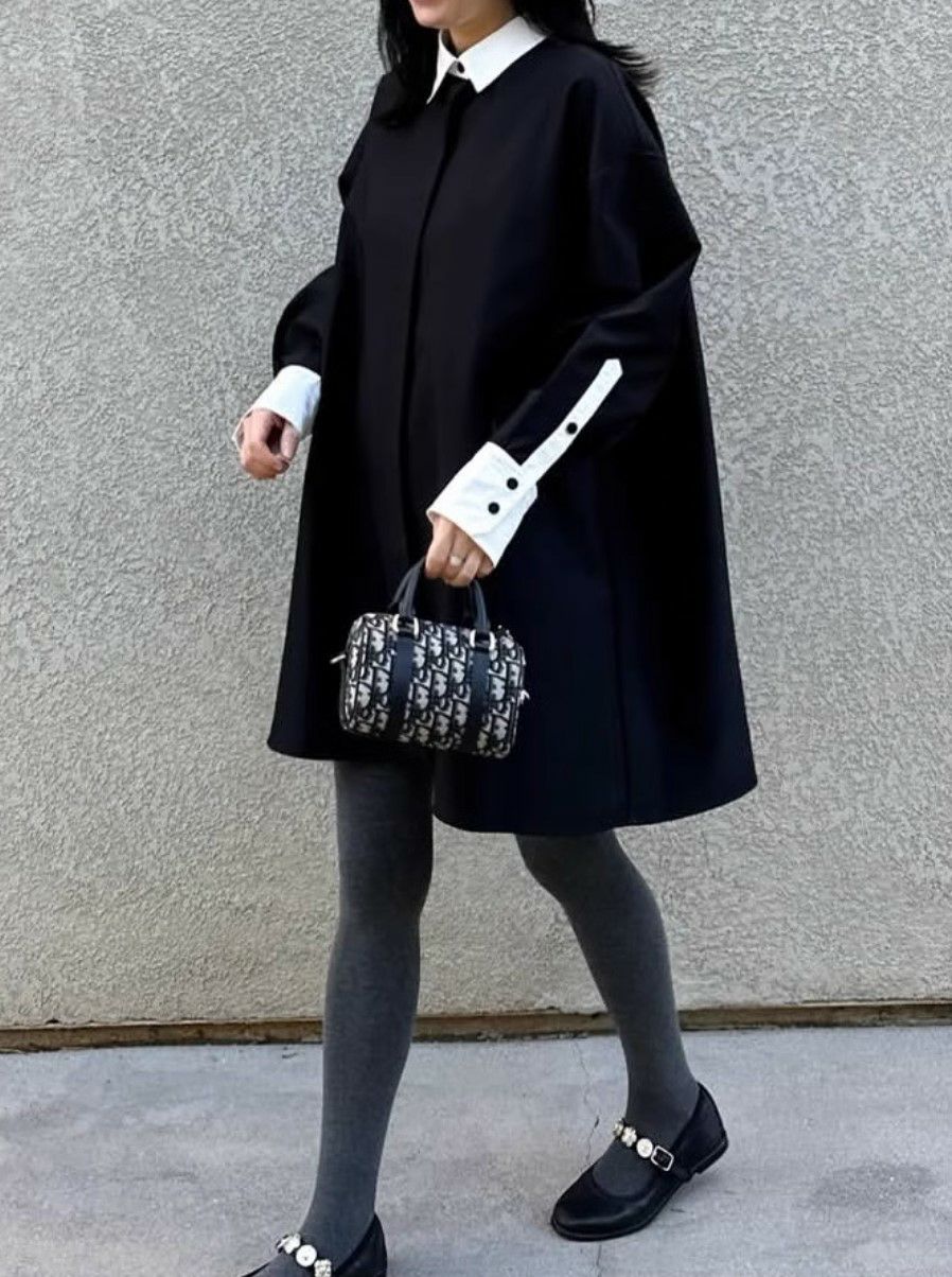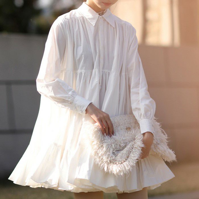 予約* 2color バンドカラー シャツ 袖コンシャス 長袖 ティアード フレア シャツ ワンピース