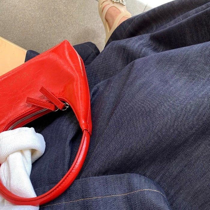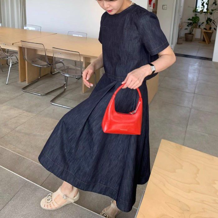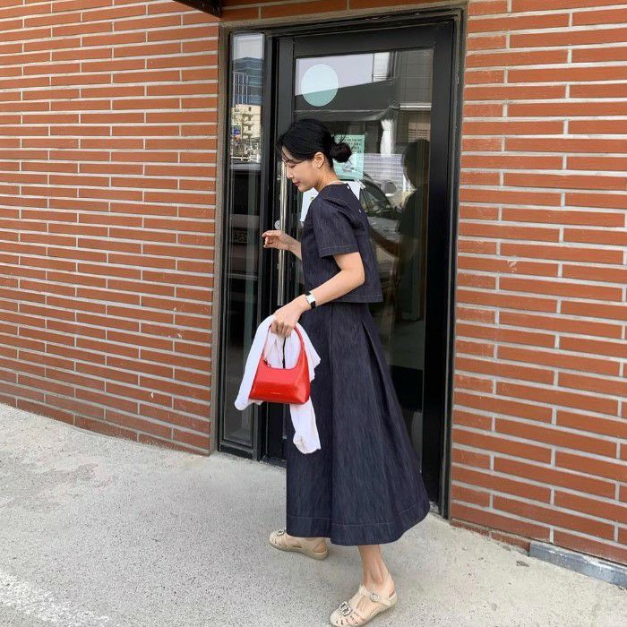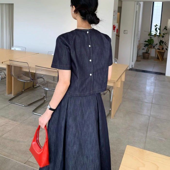 クルーネックトップスとスカートのデニムシャツ セットアップ