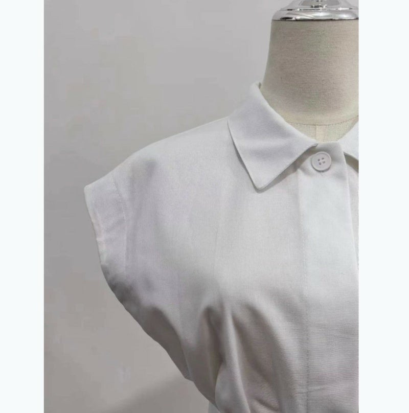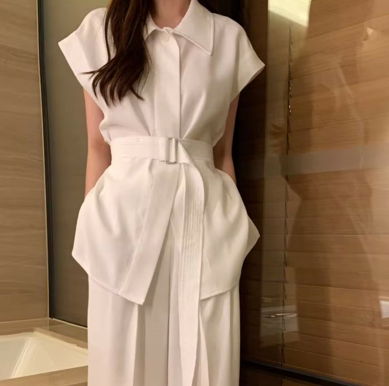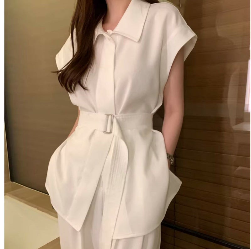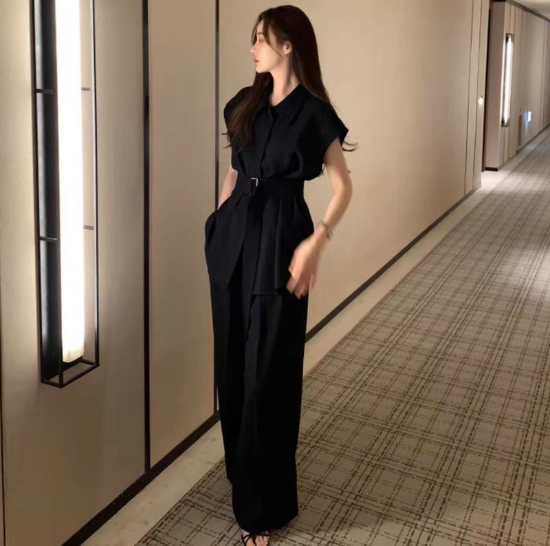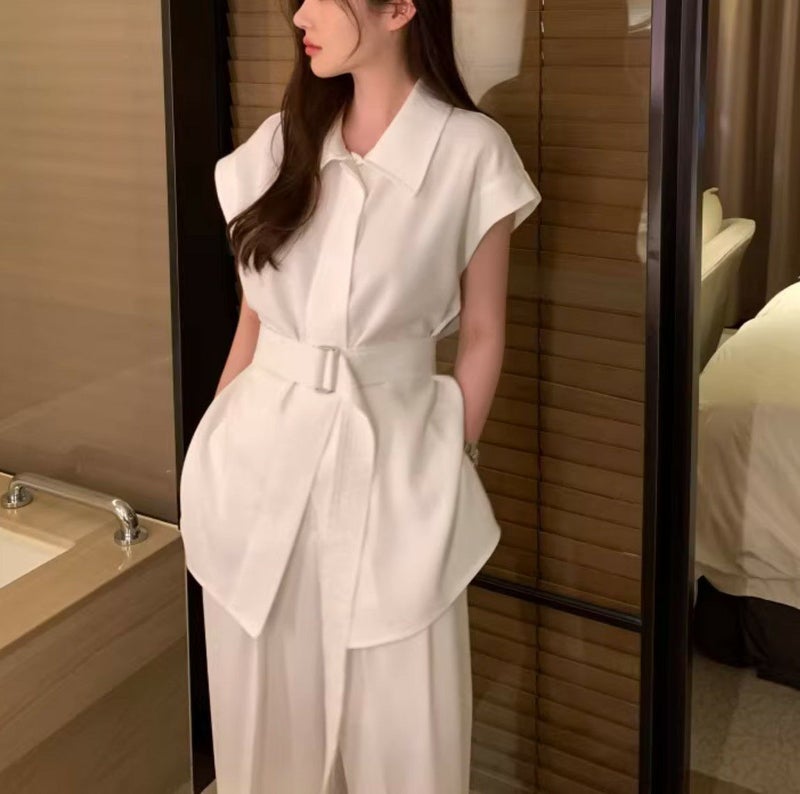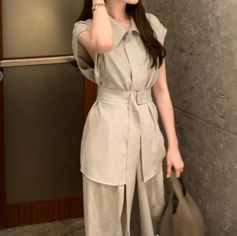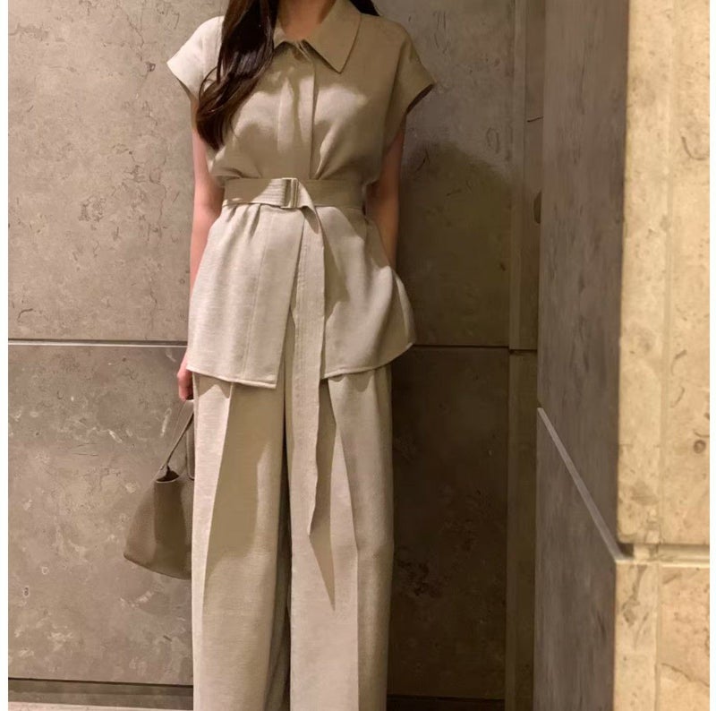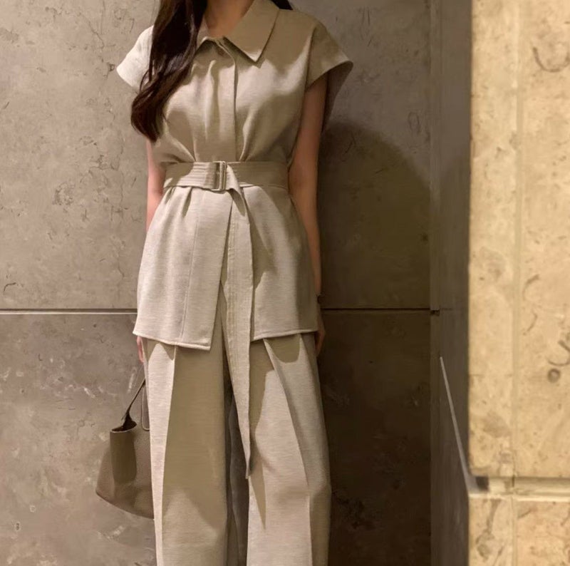 一部即納 3color 2setup リネンライク フレンチスリーブシャツ + ワイドパンツ