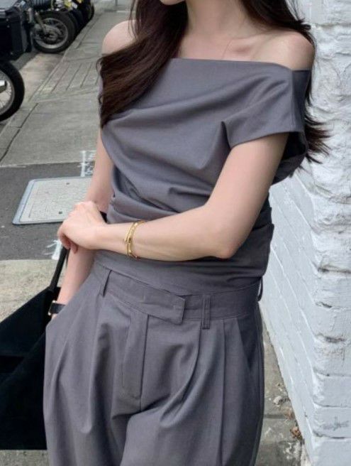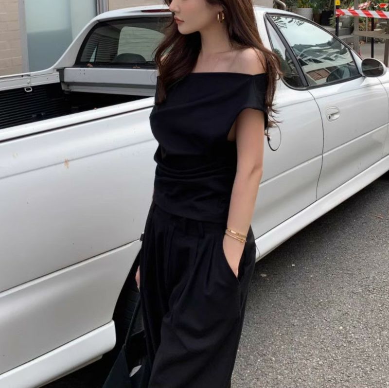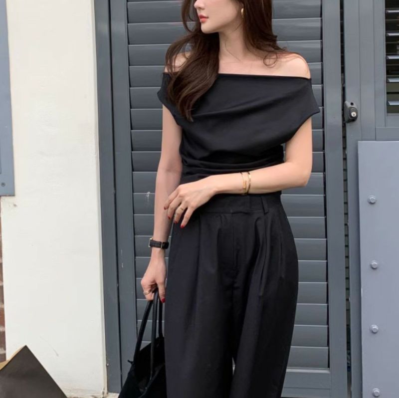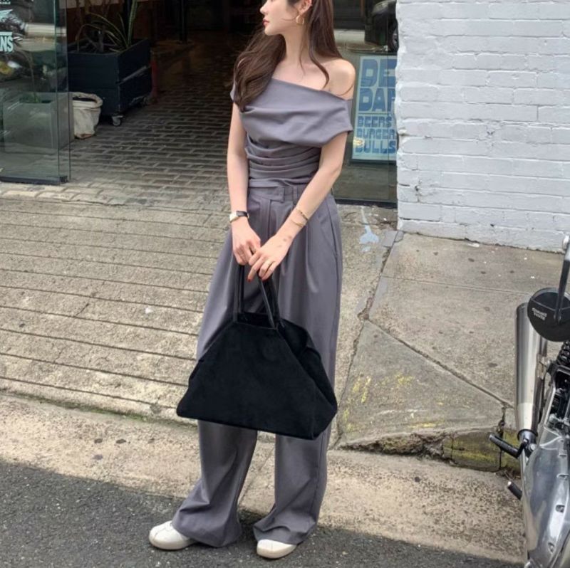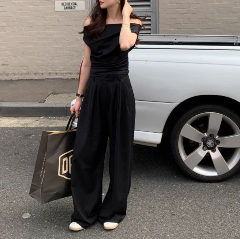 予約 2color オフショルダー ドレープ トップス + ストレート パンツ