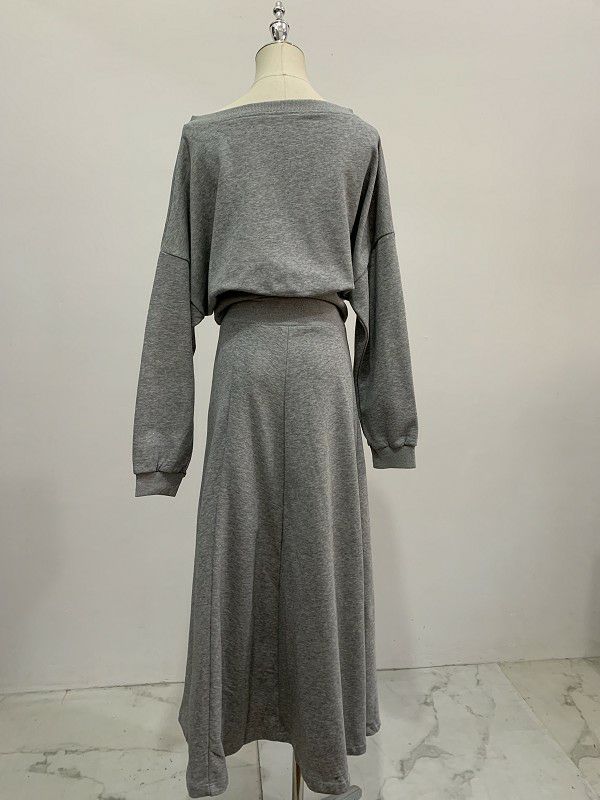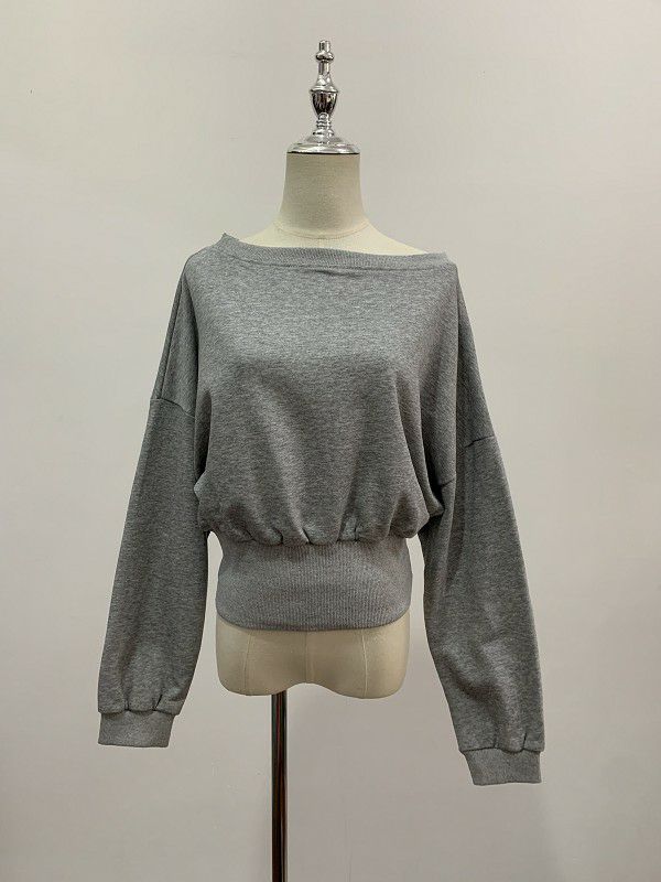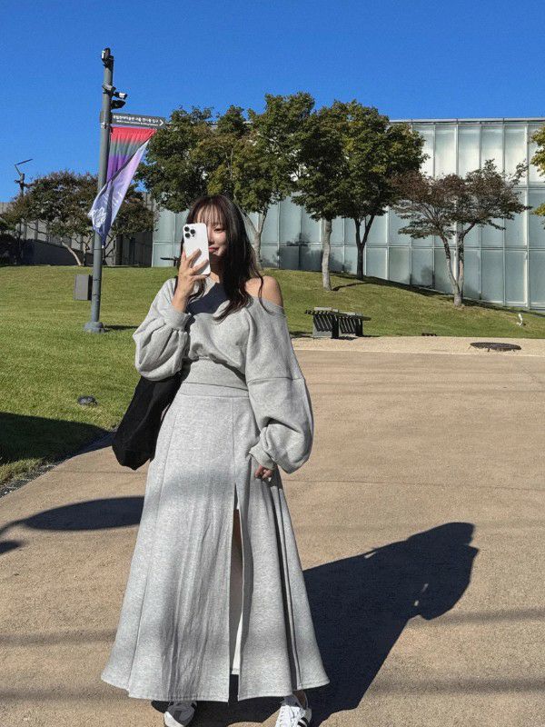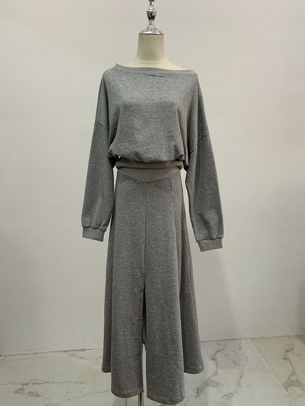 カジュアルな素材の中にオフショルダーやスリットのデザインで女性らしさも。