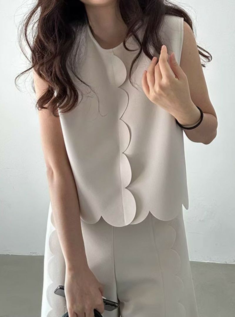 トップスは裾のスカラップカットが女性らしさを演出し、