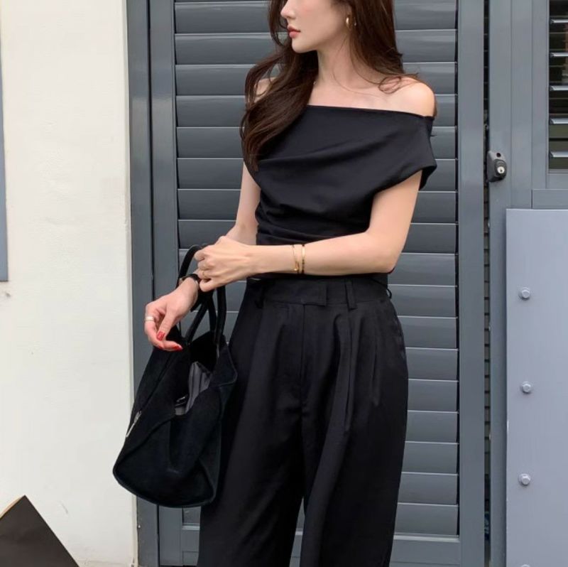 予約 2color オフショルダー ドレープ トップス + ストレート パンツ