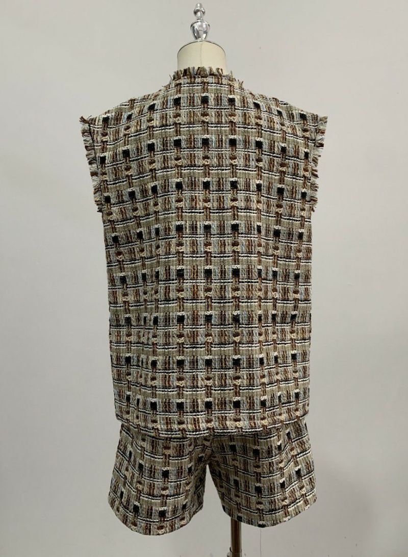 上品なツイード生地で仕立てた、ジレとショートパンツのセットアップ。