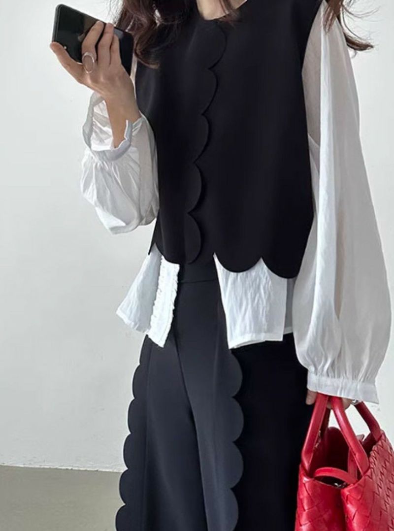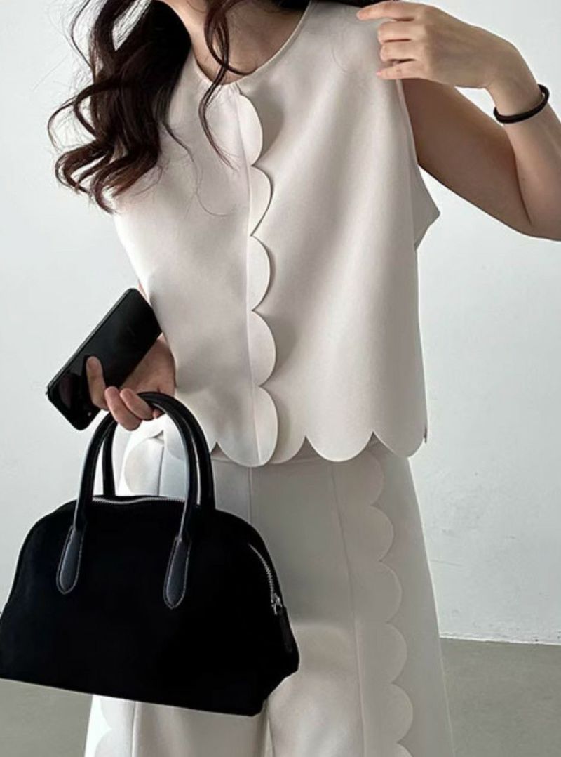 トップスは裾のスカラップカットが女性らしさを演出し、