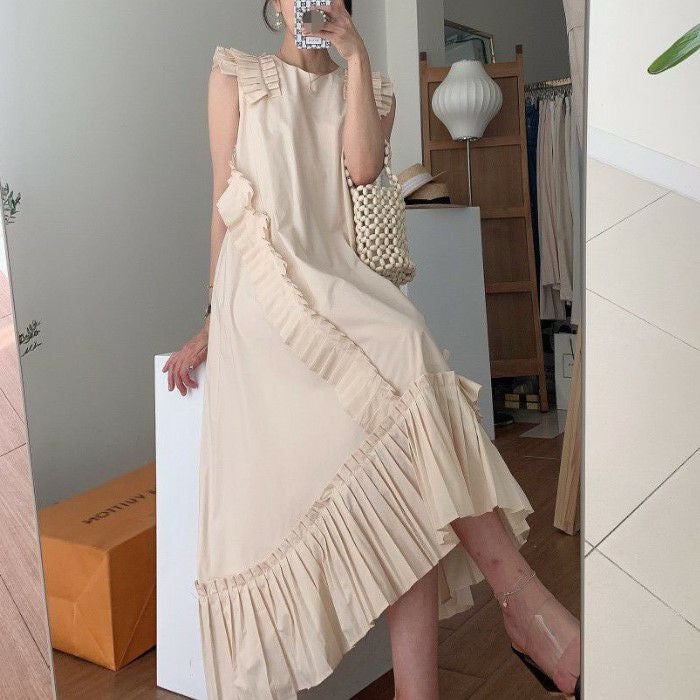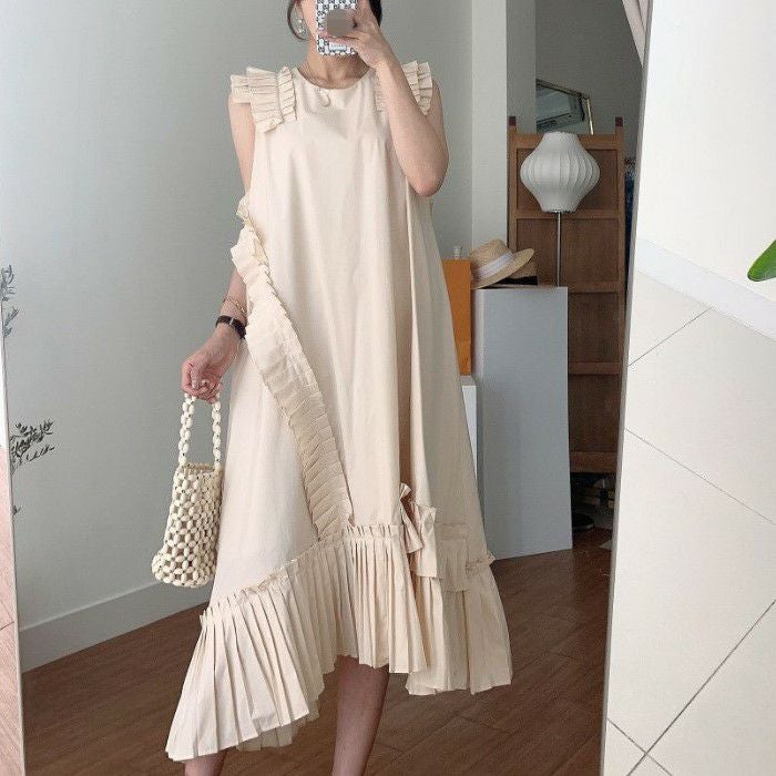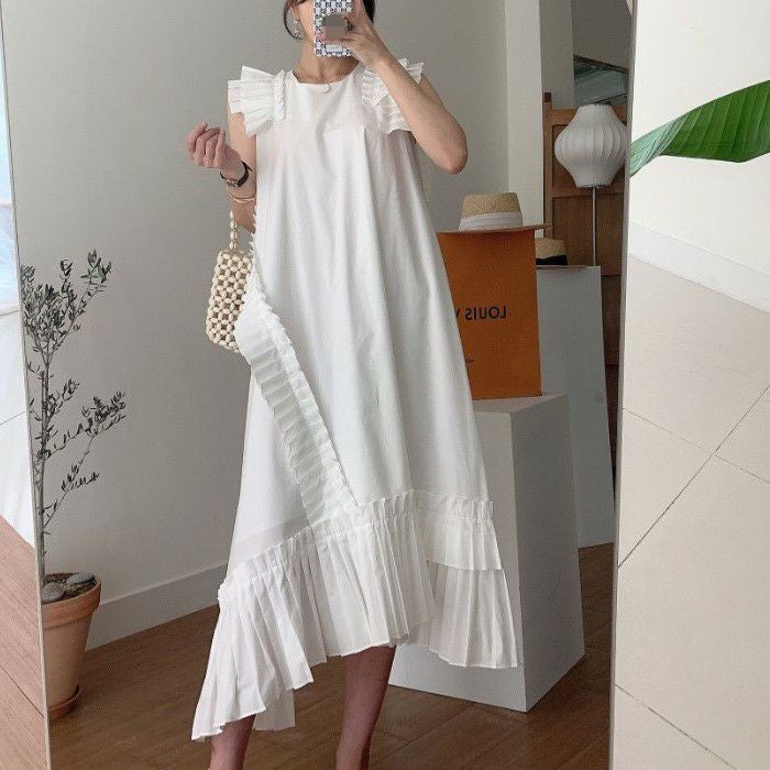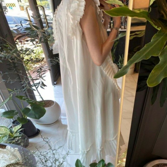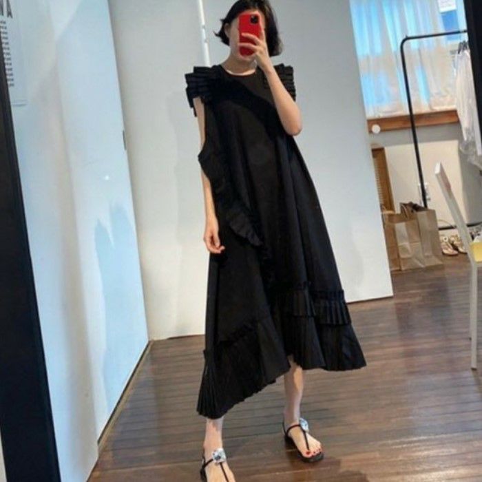予約* 3color プリーツ フリル アシンメトリー デザイン ロング丈 ワンピース
