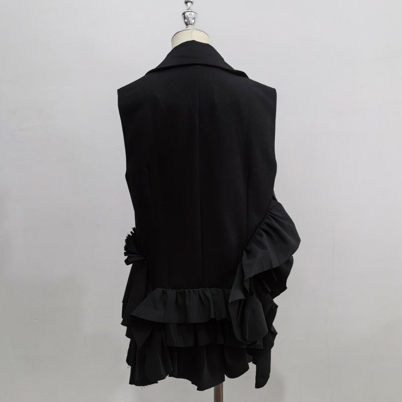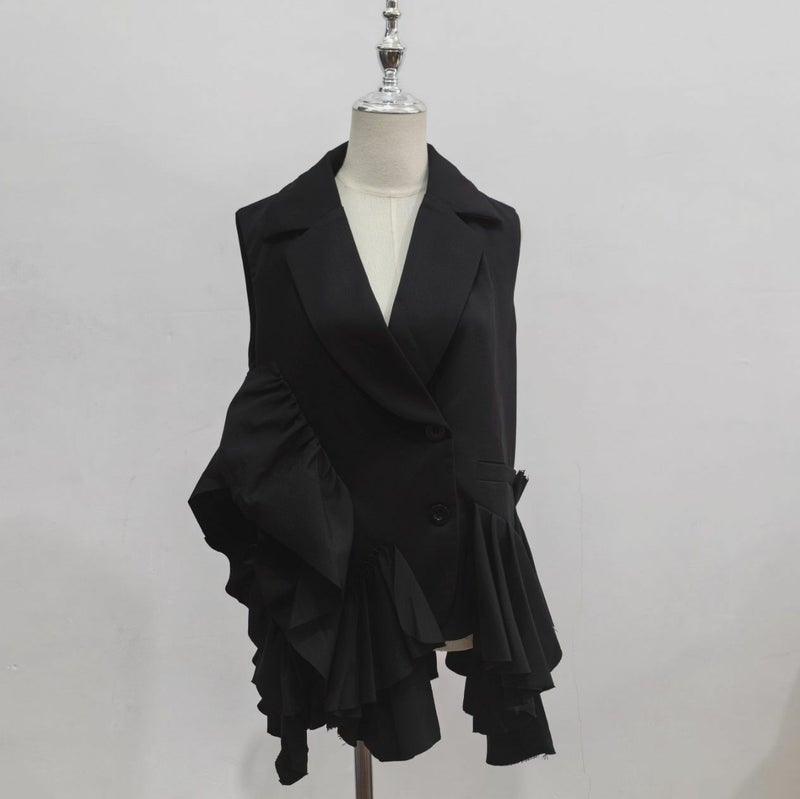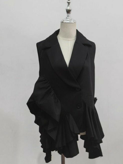 デコラティブなフリルの配置が個性的なテーラードジレ