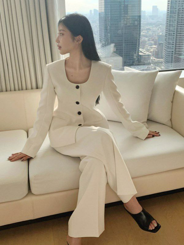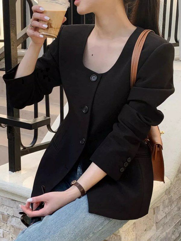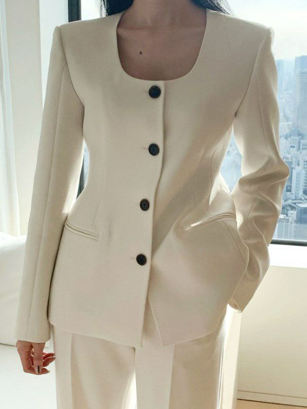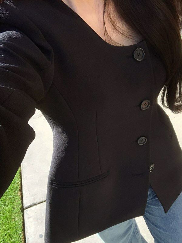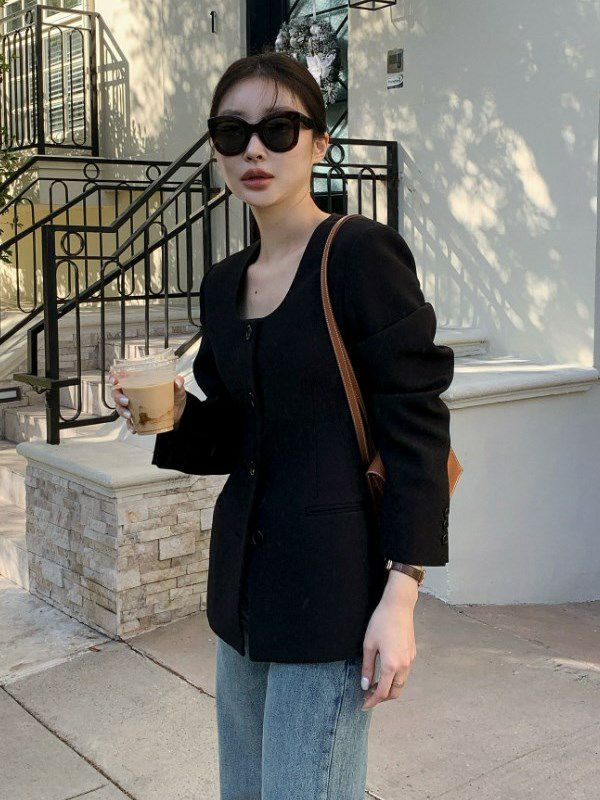 Uネックが特徴の、若干オーバーデザインのノーカラージャケット。