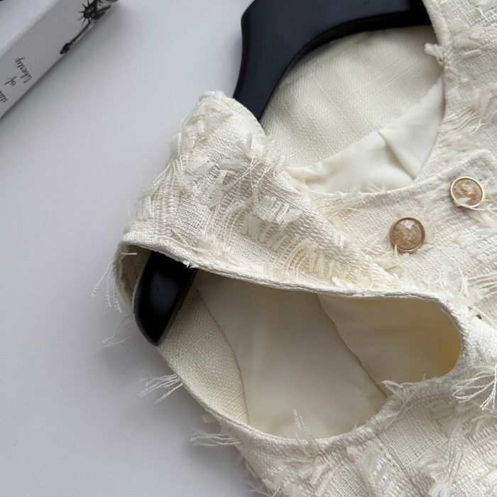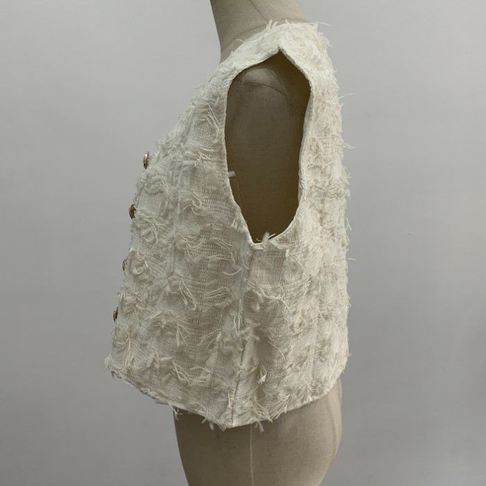 フェザー調の生地が今期らしく可愛いミニマルな丈のジレ