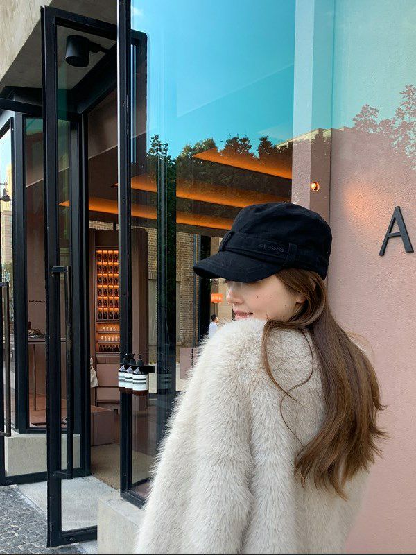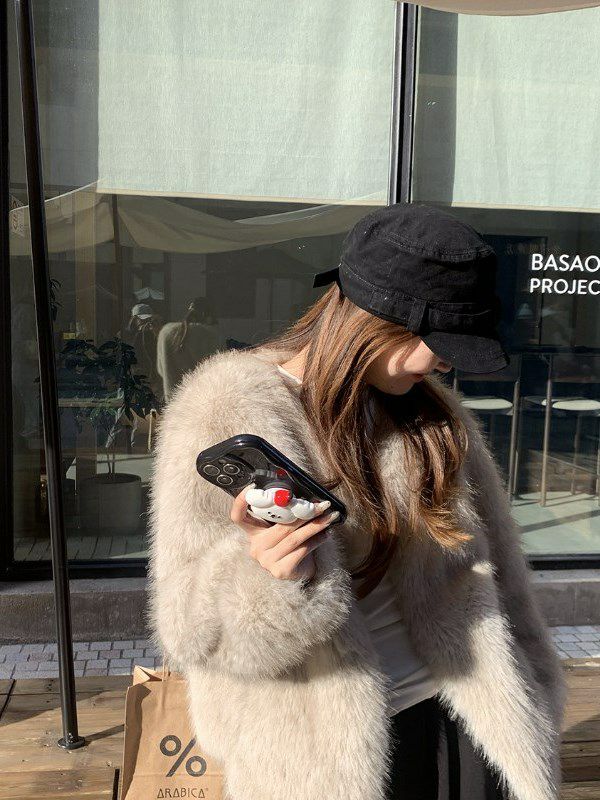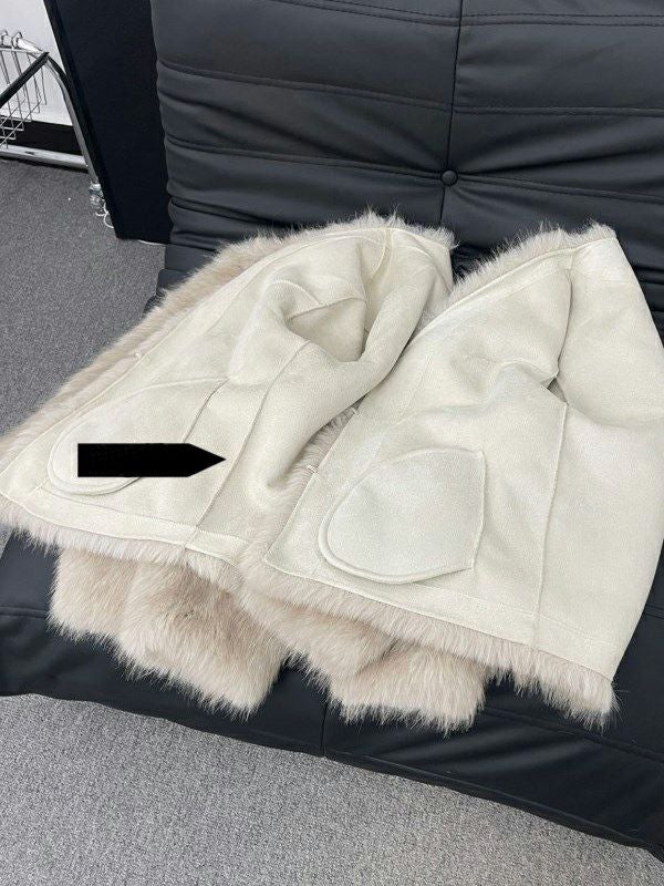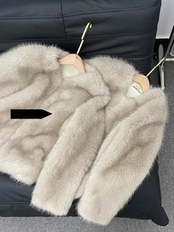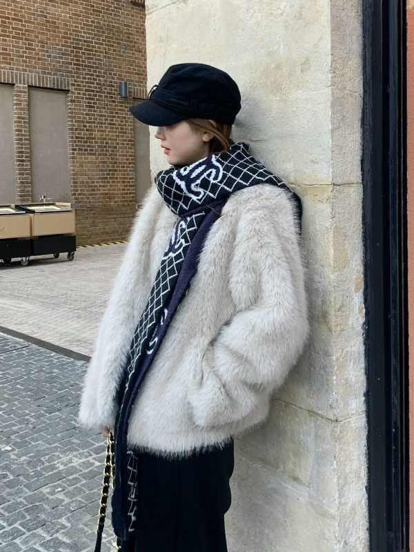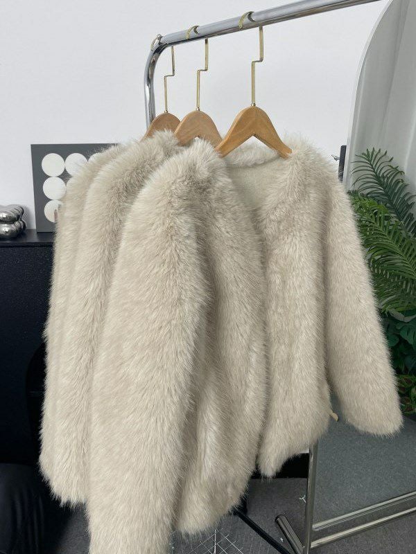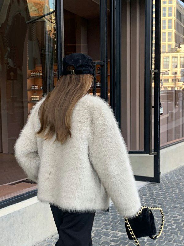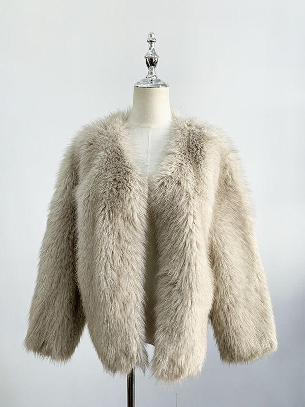 Vネックの直線的なカッティングが、エコファーの存在感をすっきりと引き立てるコート。