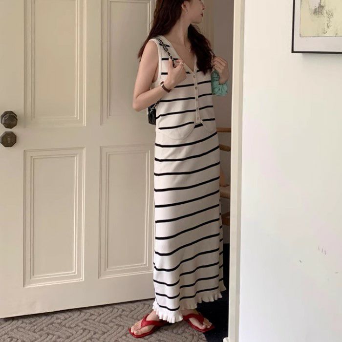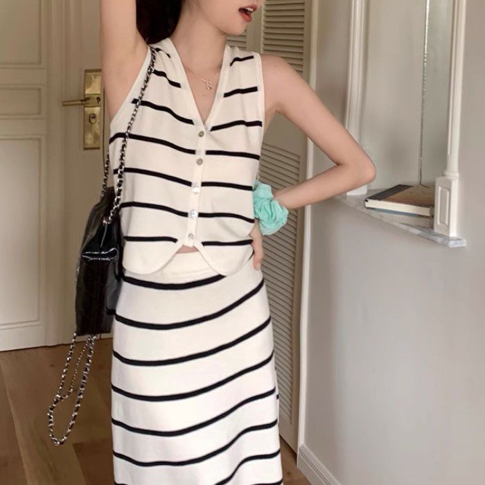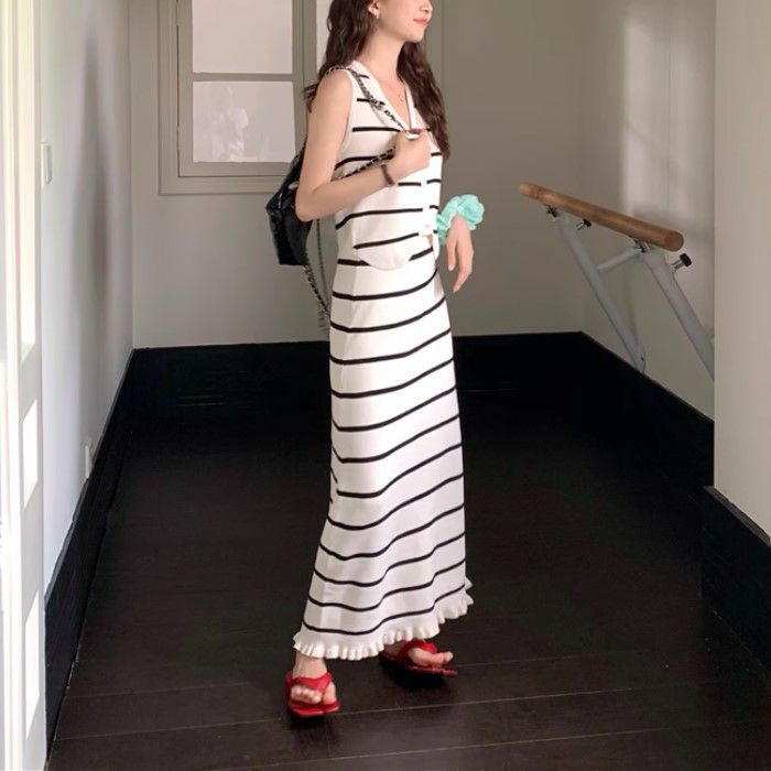 2set ボーダー ニット ジレ セットアップ タイト ロングスカート
