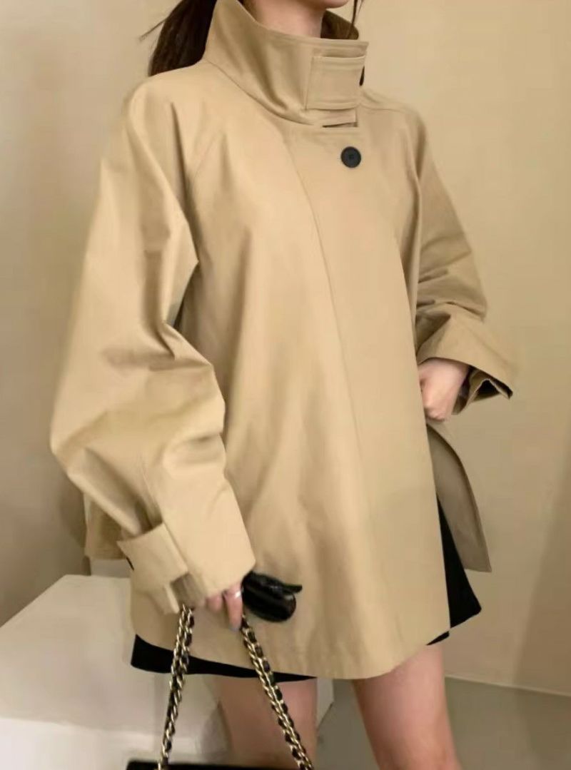 Aラインのフレアとハイカラーがマニッシュなトレンチコート
