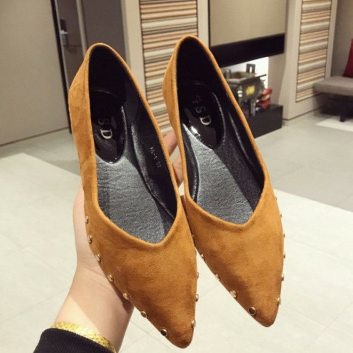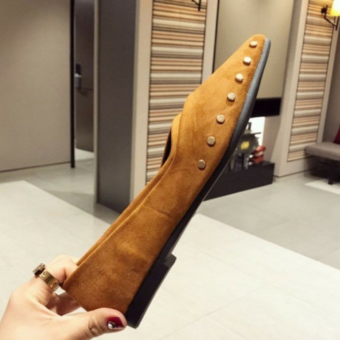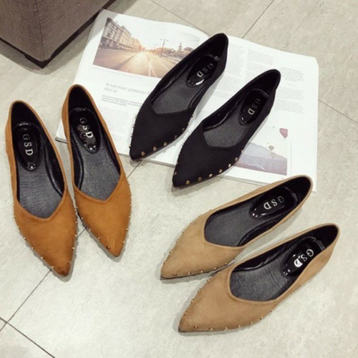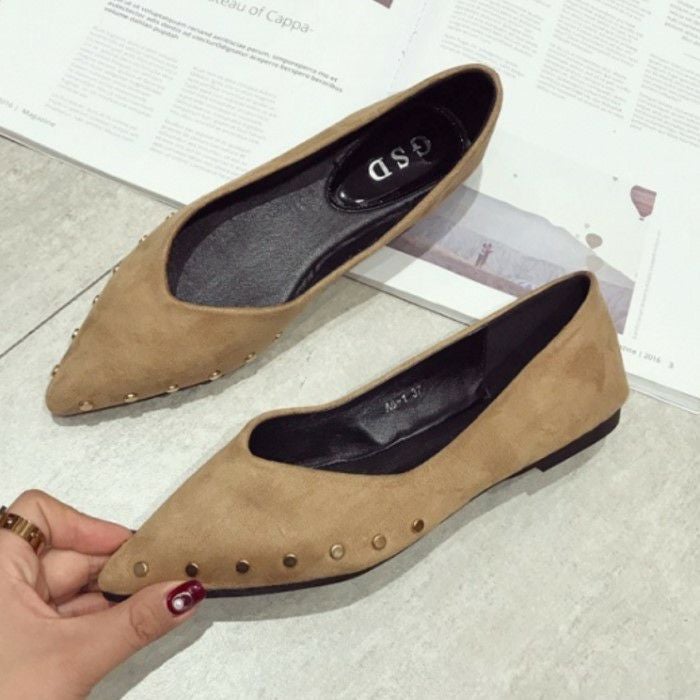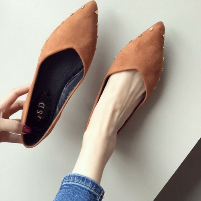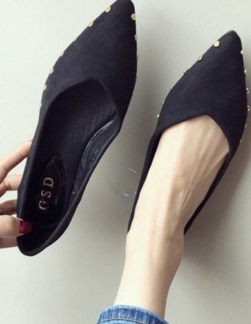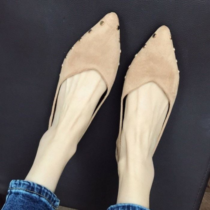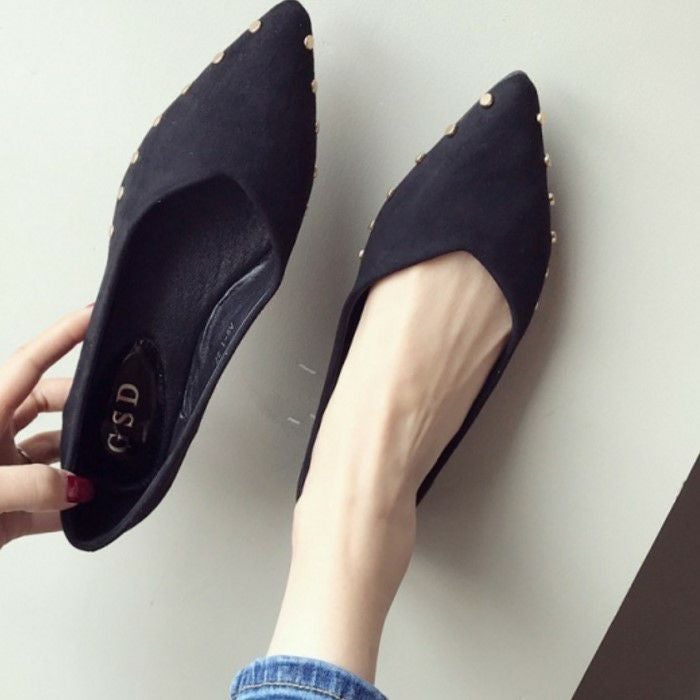 スタッズがポイントとなる、シンプルで大人っぽいフラットパンプス